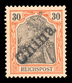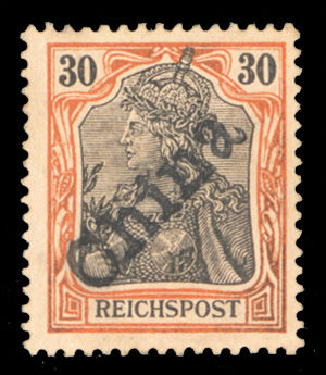 COLONIES German Offices in China - Tientsin Issue (21) 1900 30pf orange & black on salmon paper, large part original, disturbed gum (as often), v.f., signed Bloch, with 2005 Jaschke-Lantelme and 2011 Sismondo certificates (Mi.12, Euro 6,000) cat.