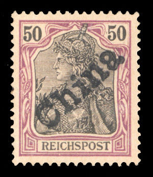 COLONIES German Offices in China - Tientsin Issue (22) 1900 50pf purple & black, n.h., signed Bartels, Bothe, also Sismondo, with his 2011 certificate, v.f. This is one of very few never hinged examples of the Tientsin 50pf handstamp. A condition