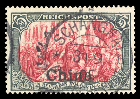 COLONIES German Offices in China (36) 1901 5m slate & carmine, Type I (completely unretouched), neat Shanghai cds, fine (Mi.27I, Euro 3,000) cat. value $2400