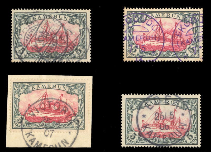 COLONIES Cameroun (19) 1900 5m slate & carmine, four used examples, canceled "Victoria", "Ekododo", "Edea" and "Duala", first one on piece, v.f., last two signed Bothe (Mi.Euro 2,400) cat. value $1800 (Image)
