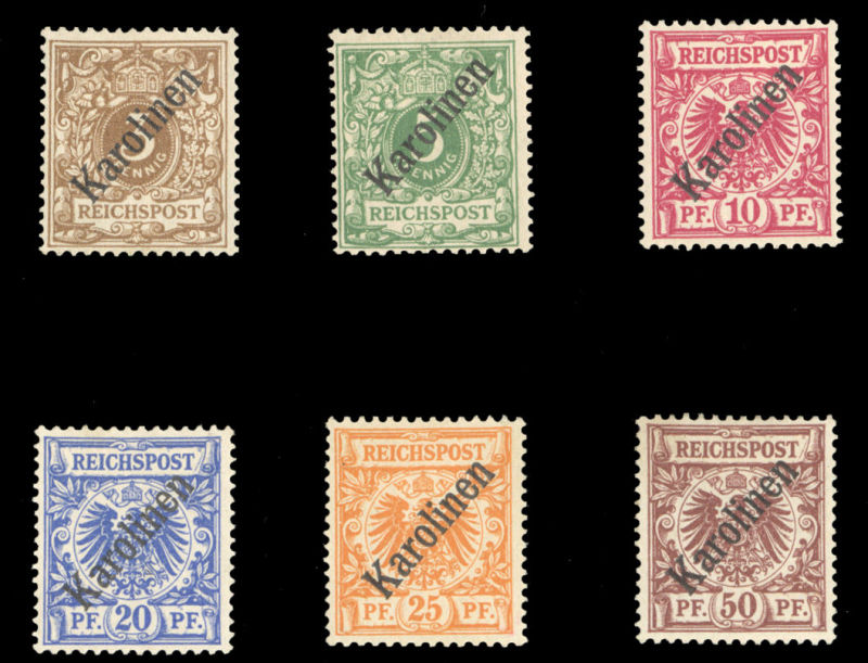 COLONIES Caroline Islands (1a-6a) 1899 overprinted at 48 degree angle, 3pf-50pf complete set of six, l.h. or h.r., signed Bothe, Richter, Ebel, etc., fine-v.f., scarce (Mi.I-6I, Euro 4,000) cat. value $3270 (Image)