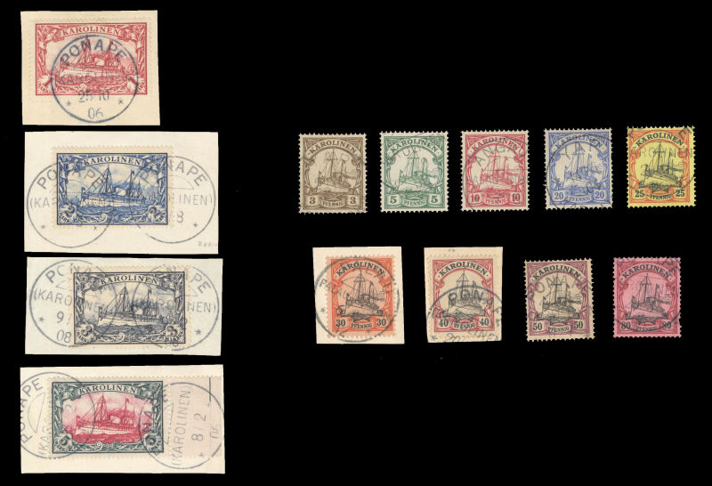COLONIES Caroline Islands (7-19) 1901 Kaiser's Yacht, complete set used, top values canceled on pieces, fine-v.f., signed Drahn, Buhler, etc. (Mi.Euro 1,000) cat. value $801