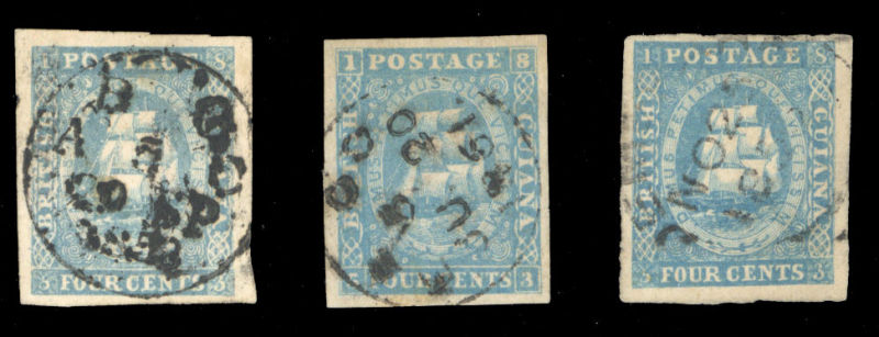 COMMONWEALTH BRITISH GUIANA (10a,10b) 1853 4c deep blue, 4c pale blue (2), canceled "De No.25 1855" (Demerara), "B G A5C 20 SP 1853" (Sparta) and "B G E5C Ju 20 1861" (Mahaica), each with margins all around, v.f., various signatures, with 2019