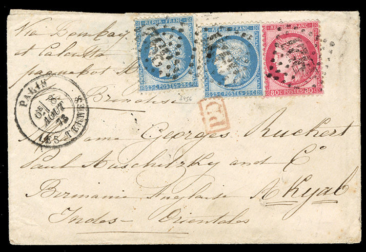 COMMONWEALTH BURMA 1873 (8 Aug) incoming cover from Paris to Akyab, paying 1.30fr with a 25c (2) and 80c Ceres, tied by "3921" large numerals, endorsed via "Bombay et Calcutta Paquebot Anglaise via Brindisi", marked "PD" to destination, "Sea Post