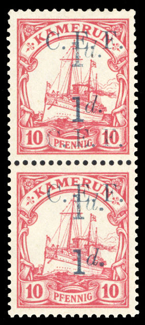 COMMONWEALTH CAMEROON (55b,var) 1915 1d on 10pf carmine, vertical pair, positions 89 and 99, top stamp double surcharge, bottom stamp only "1d" doubled, l.h., v.f., signed Bloch, Calves, with 2001 Sismondo certificate. A rare positional piece, only