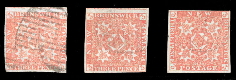 COMMONWEALTH CANADIAN PROVINCES - New Brunswick (1) 1851 3p red, three used singles, slight different shades, margins all around, mostly v.f., cat. value $1725