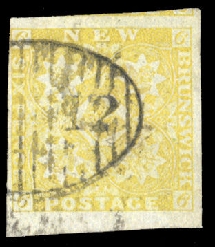 COMMONWEALTH CANADIAN PROVINCES - New Brunswick (2) 1851 6p olive yellow, oval cancel, large margins, showing portion of adjoining stamp at top, v.f., with 1962 BPA certificate, cat. value $1200 (Image)