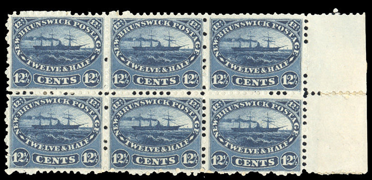 COMMONWEALTH CANADIAN PROVINCES - New Brunswick (10) 1860 12 1/2c blue, right sheet margin block of six, h.r., fine, cat. value $540 (Image)