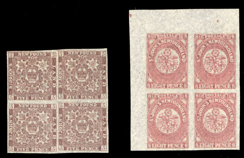 COMMONWEALTH CANADIAN PROVINCES - Newfoundland (19b,22) 1861 5p chocolate brown, 8p rose, blocks of four, the former l.h. at top, bottom stamps n.h., the latter sheet corner margin, n.h., v.f., cat. value $1340 (Image)
