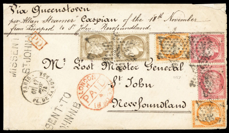 alongside, endorsed "Via Queenstown per Steamer Caspian from Liverpool to St. John Newfoundland", red London transit and "Missent to St. John, N.B." (New Brunswick), repeated on back, arriving St. John, Newfoundland (18.12.73), fine and attractive