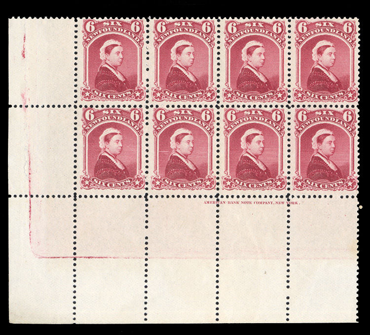 COMMONWEALTH CANADIAN PROVINCES - Newfoundland (36) 1868 6c carmine lake, bottom left sheet corner margin "American Ban Note Company New York" imprint block of eight, n.h., fine-v.f. (catalogued as singles) cat. value $960 (Image)
