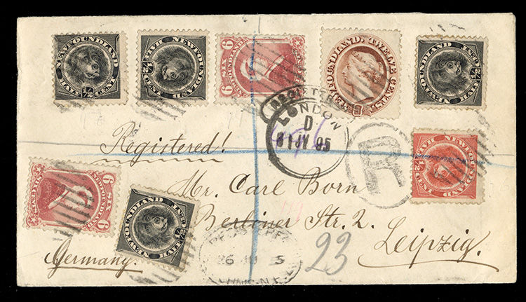 COMMONWEALTH CANADIAN PROVINCES - Newfoundland (28,36,56,58) 1895 (26 July) registered cover from St. John's to Leipzig, attractively franked with eight adhesives, including 1/2c black (4), 1/2c red, 6c rose (2) and 12c lilac brown, tied by grid