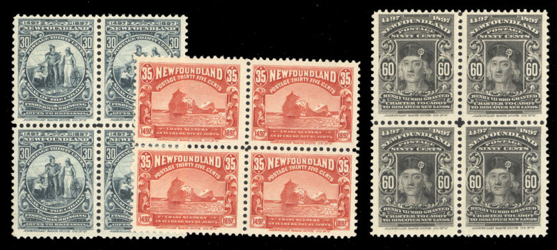 COMMONWEALTH CANADIAN PROVINCES - Newfoundland (72-74) 1897 Cabot, 30c slate, 35c red, 60c black, three different blocks of four, n.h., 35c with fingerprints on top two stamps, otherwise fine-v.f., cat. value $1488 (Image)