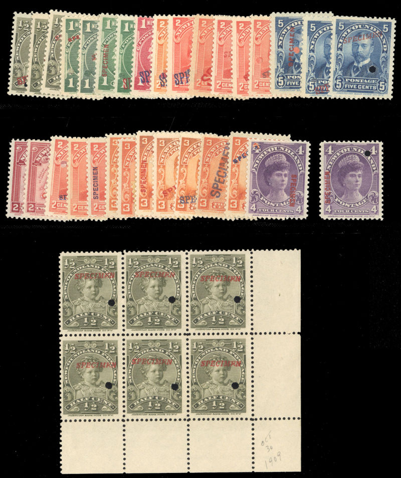 COMMONWEALTH CANADIAN PROVINCES - Newfoundland (78/86S) 1897-1901 1/2c-5c "Specimen" overprints, various colors and sizes, each with security punch, selection of 31 different, 2-8 of each value, also block of 6x1/2c olive green, red overprint, n.h.,