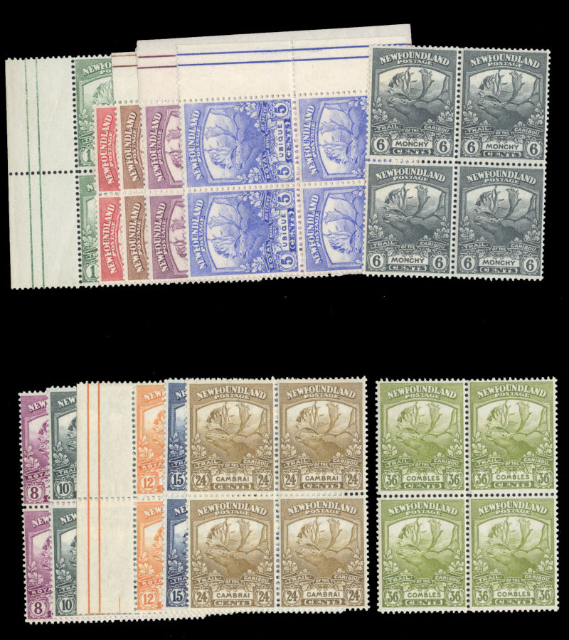 COMMONWEALTH CANADIAN PROVINCES - Newfoundland (115-26) 1919 Caribou, complete set in blocks of four, n.h., fine-v.f., cat. value $2466 (Image)