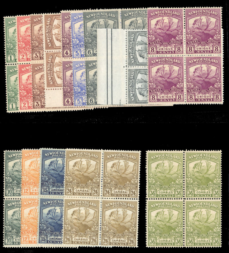 COMMONWEALTH CANADIAN PROVINCES - Newfoundland (115-26) 1919 Caribou, complete set of 12, also additional shades of 3c and 6c, blocks of four, n.h., fine-v.f., cat. value $2674 (Image)
