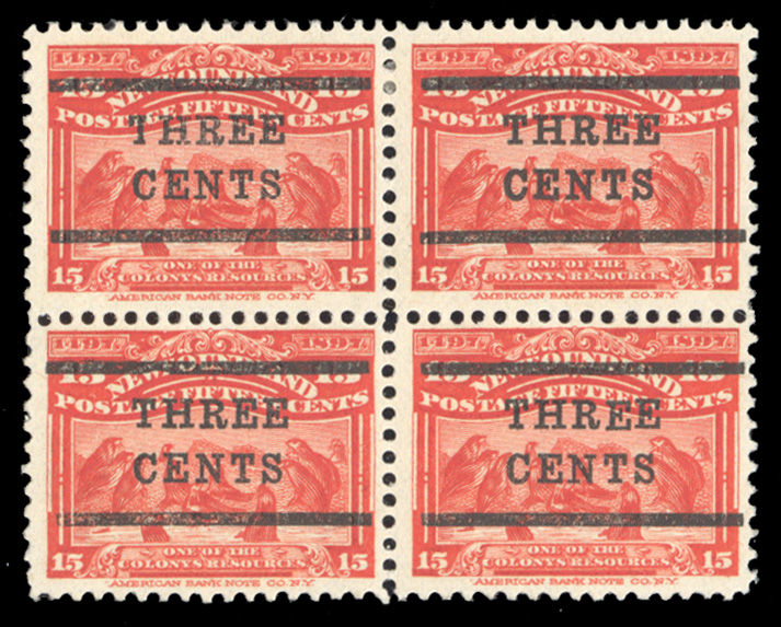 COMMONWEALTH CANADIAN PROVINCES - Newfoundland (128) 1920 3c on 15c scarlet, Type I surcharge, block of four, l.h. at top, bottom stamps n.h., fine-v.f., cat. value $1120