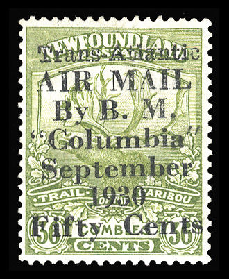 & Lt. Harry Connor, which made the trip from Harbour Grace to Croydon Airport, London. Only 300 copies of the 35c Caribou stamp were overprinted, of which at least half were used), cat. value $9000 (Image)