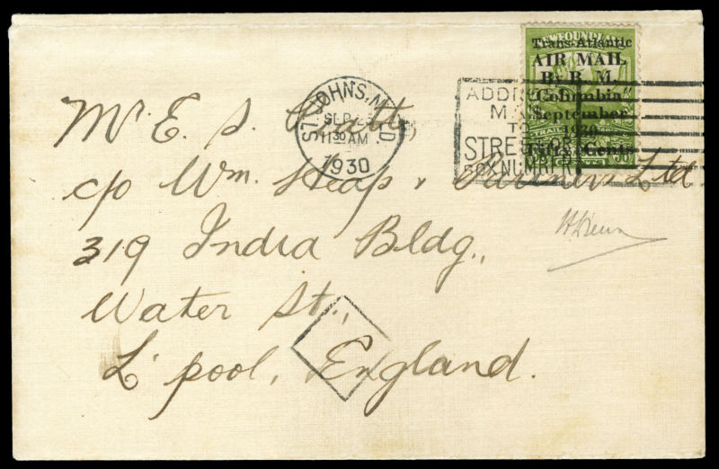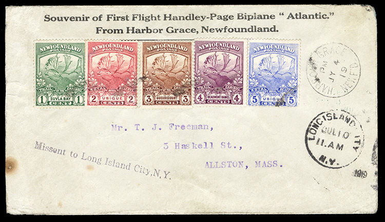 COMMONWEALTH CANADIAN PROVINCES - Newfoundland Flight Covers 1919 (4 July) "Souvenir of First Flight Handley-Page Biplane "Atlantic" from Harbour Grace, Newfoundland" cover to Allston, Mass., attractively overfranked, faint "Missent to Long Island