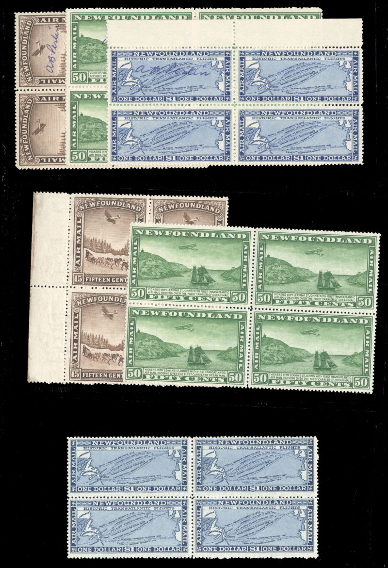 COMMONWEALTH CANADIAN PROVINCES - Newfoundland Air Post (C6-11) 1931 15c-$1 blocks of four, one set each signed on face by A.B.Perlin (designer), n.h., also watermarked blocks of four, one set each l.h., balance n.h., fine-v.f., cat. value $1680 (Image)