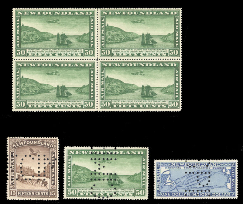 COMMONWEALTH CANADIAN PROVINCES - Newfoundland Air Post (C6,7, C6S-8S) 1931 Issue, 15c, 50c and $1 perforated "Specimen", also 50c and $1 blocks of four (cat. $780), n.h., fine-v.f. (Image)