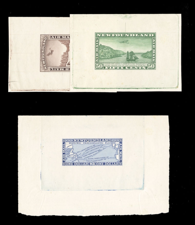 COMMONWEALTH CANADIAN PROVINCES - Newfoundland Air Post (C9-11P) 1931 Pictorial Issue, 15c-$1, set of three large die proofs in issued colors on thick unwatermarked white wove paper, v.f. (Image)