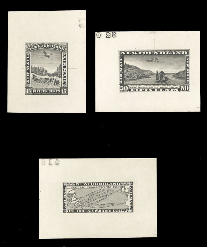COMMONWEALTH CANADIAN PROVINCES - Newfoundland Air Post (C9-11P) 1931 Pictorial Issue, 15c-$1, set of three large die proofs in black on unwatermarked white wove paper, each showing reversed die numbers in the margins, v.f., rare (Image)