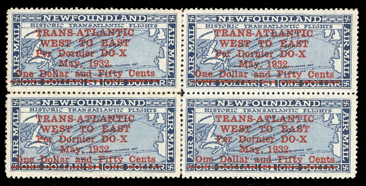 COMMONWEALTH CANADIAN PROVINCES - Newfoundland Air Post (C12) 1932 DO-X Surcharge, $1.50 on $1 blue, block of four (complete sheet), n.h., v.f., cat. value $1400