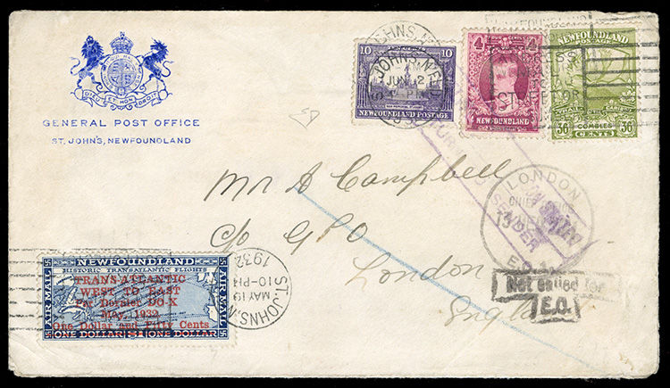 COMMONWEALTH CANADIAN PROVINCES - Newfoundland Air Post (C12) 1932 General Post Office corner card cover (re-used) franked with $1.50 Do-X (May 19), with previous 36c, 4c and 10c making up 50c franking for "Columbia" flight (June 2, 1930), with