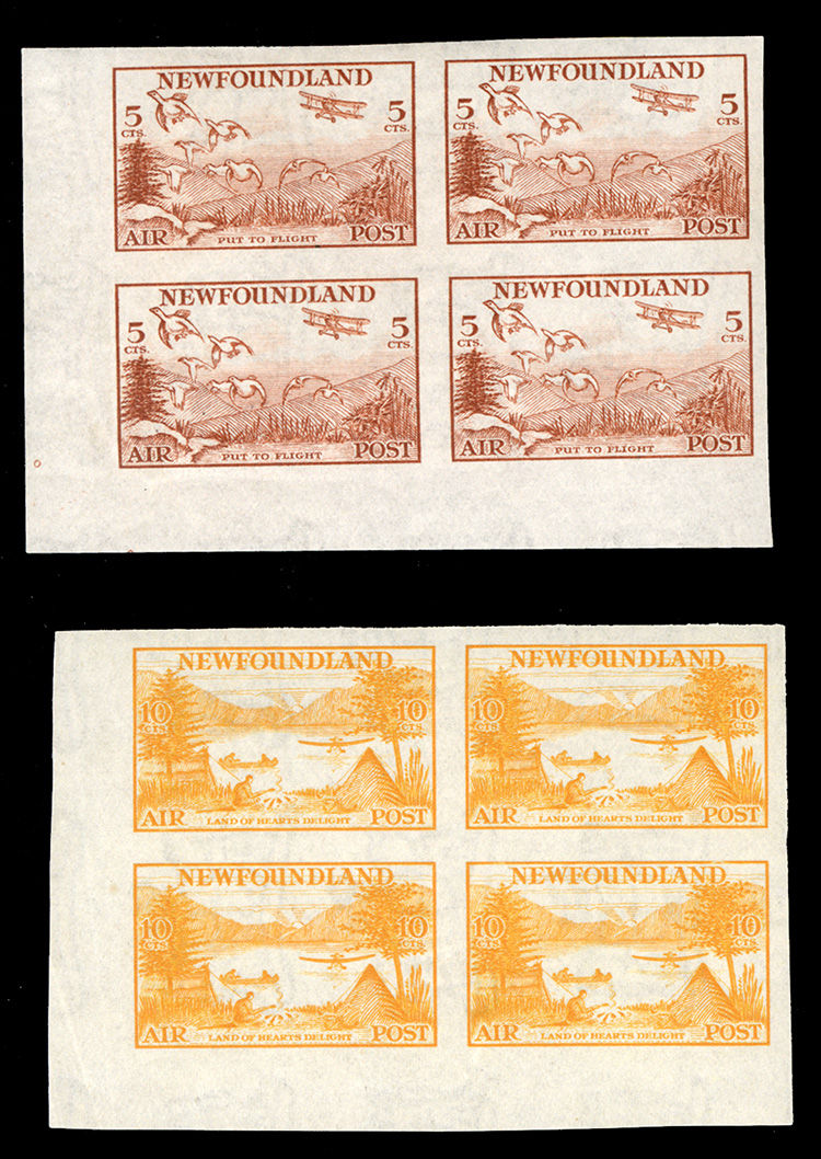 COMMONWEALTH CANADIAN PROVINCES - Newfoundland Air Post (C13a,14a) 1933 5c brown and 10c yellow, imperforate blocks of four, l.h. or n.h., v.f., cat. value $1100