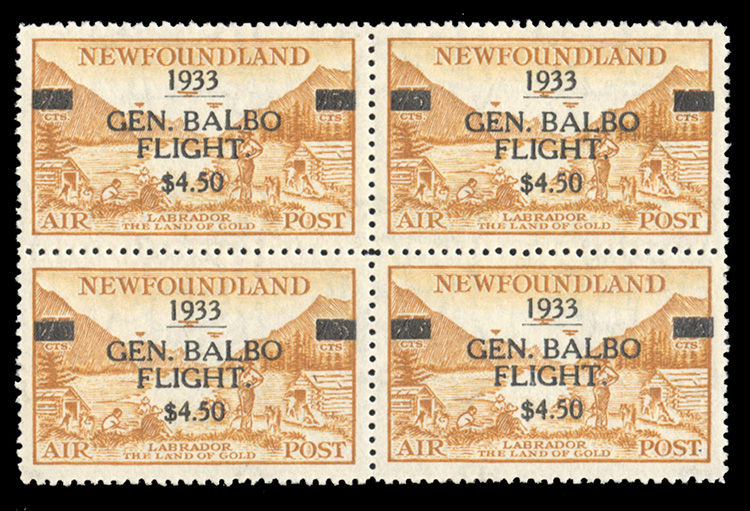COMMONWEALTH CANADIAN PROVINCES - Newfoundland Air Post (C18) 1933 $4.50 on 75c bister, General Balbo Flight overprint, block of four, n.h., v.f., cat. value $1800