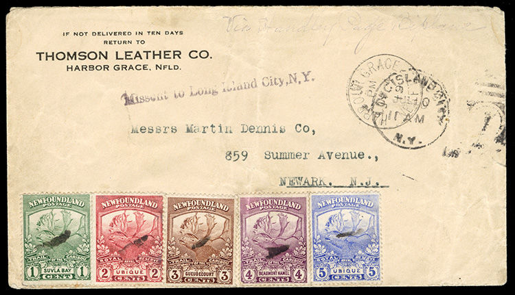 COMMONWEALTH CANADIAN PROVINCES - Newfoundland Flight Covers 1919 (4 July) Thomas Leather Co. cover to Newark, NJ, attractively overfranked, faint "Missent to Long Island City, NY" handstamp, with July 10 cds applied on front, minor creases, fine (Image)