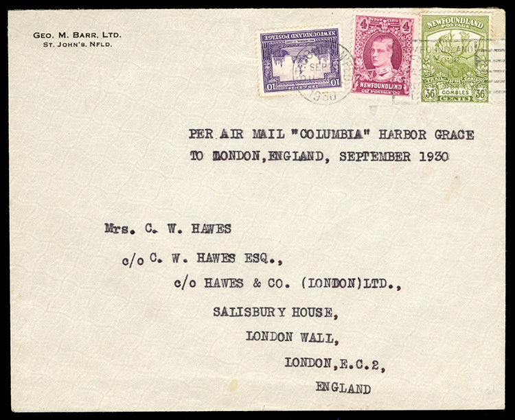 COMMONWEALTH CANADIAN PROVINCES - Newfoundland Flight Covers 1930 (25 Sep) corner card Geo.M.Barr, Ltd cover from St. John''s to England, "Per Air Mail "Columbia" Harbour Grace to London England September 1930" typewritten instructions, franked with