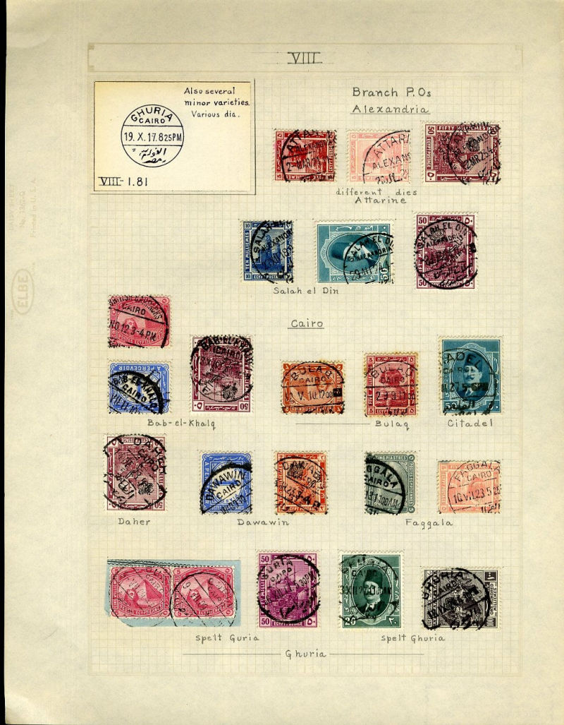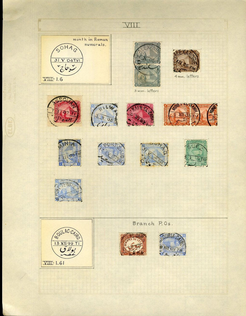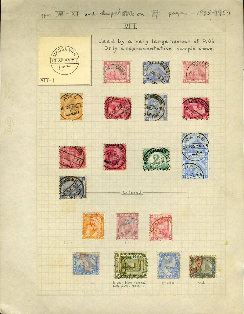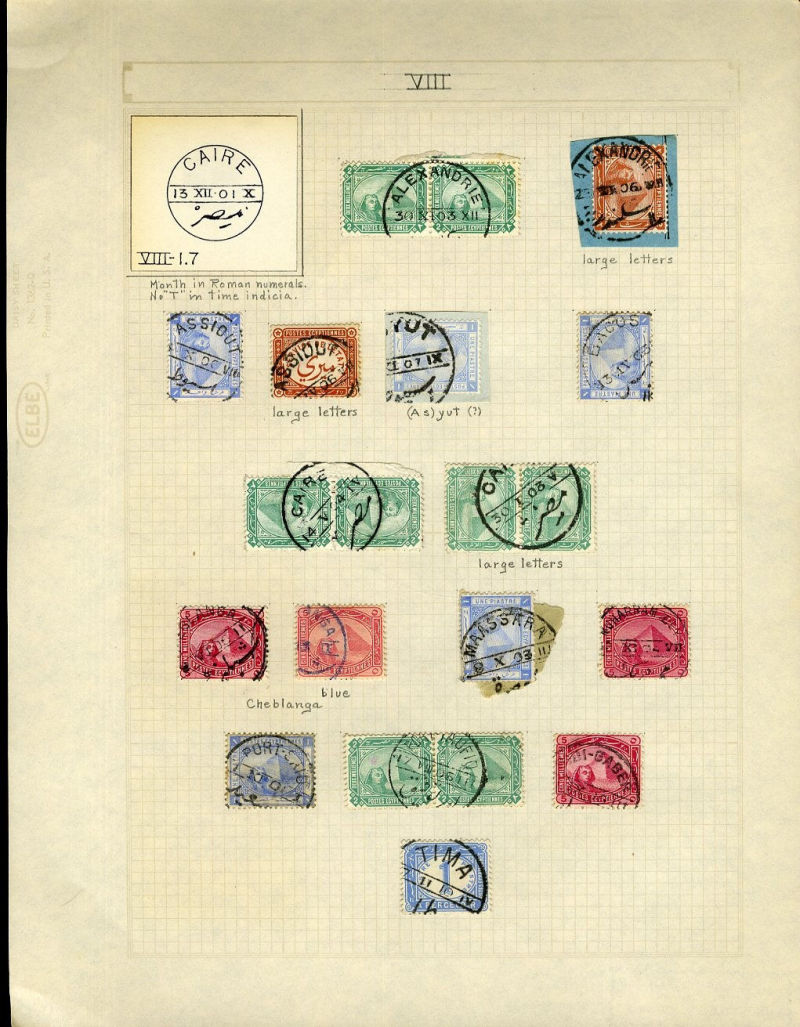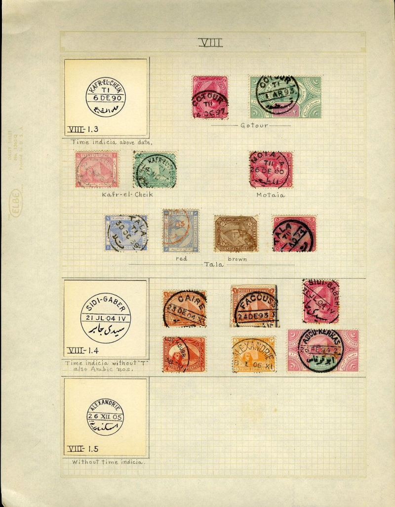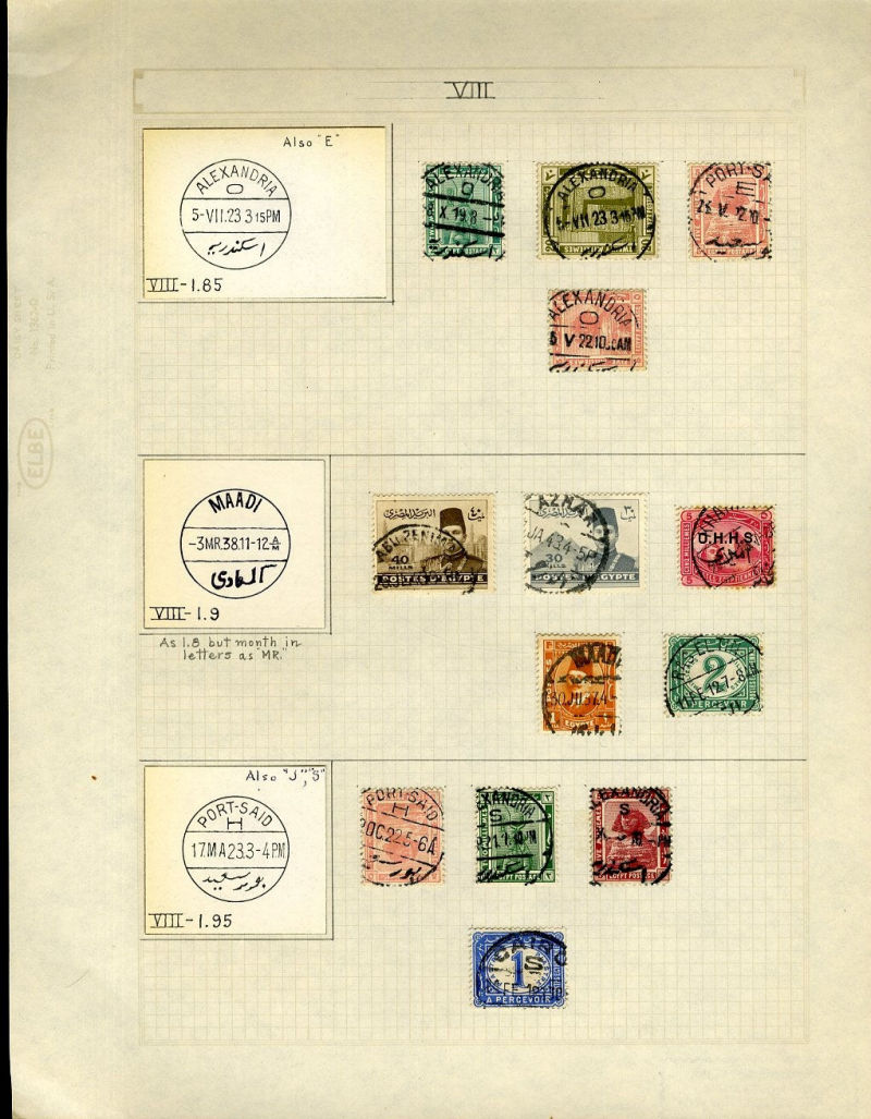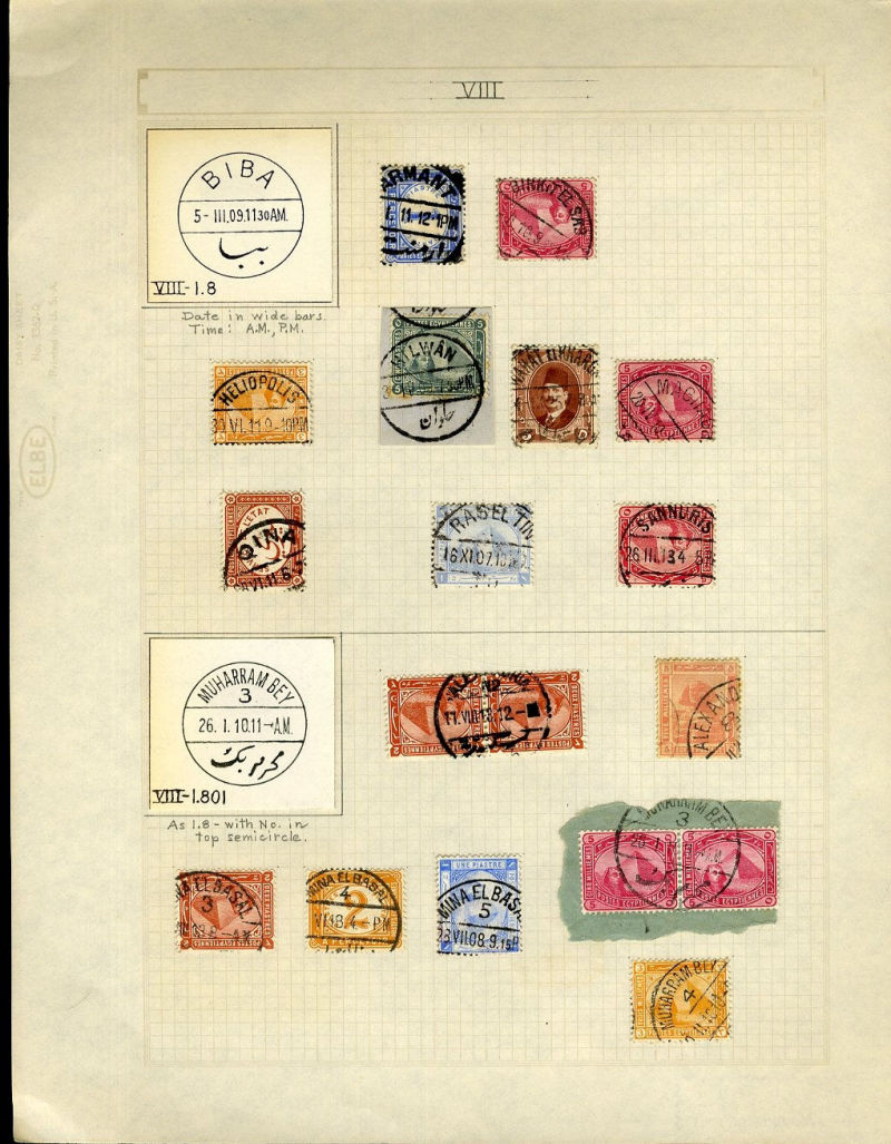 1301 O, c   imageLARGE LOTS AND COLLECTIONS EGYPT 1880s-1950s Cancelations, collection of 700+ stamps and a few covers with postmarks and postal markings (Types VIII to XII) mounted on album pages, from the collection of R. Seymour Blomfield, who is recognized for his precise drawings and work on the classification of Egyptian postmarks, interesting specialist holding (Image) (Image 2) (Image 3) (Image 4) (Image 5) (Image 6) (Image 7) (Image 8) (Image 9) (Image 10) (Image 11) (Image 12) (Image 13) (Image 14) (Image 15) (All Images)