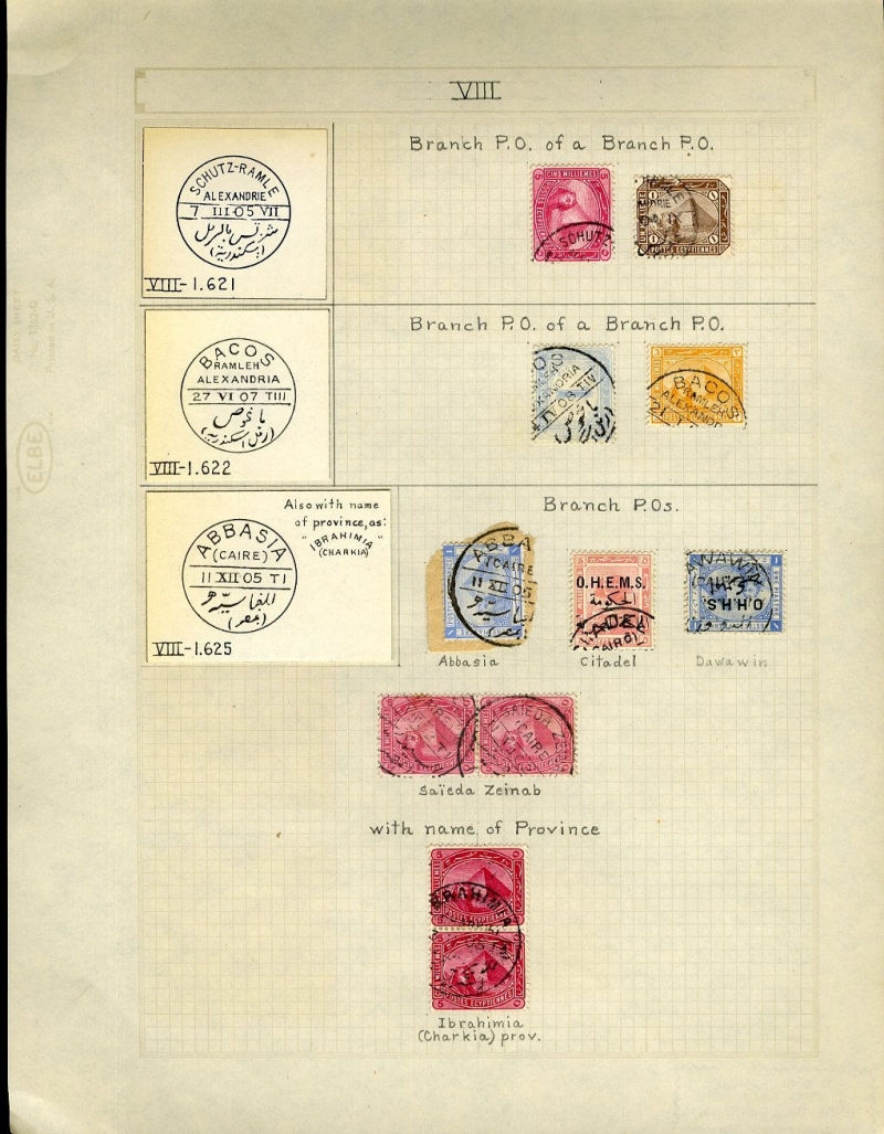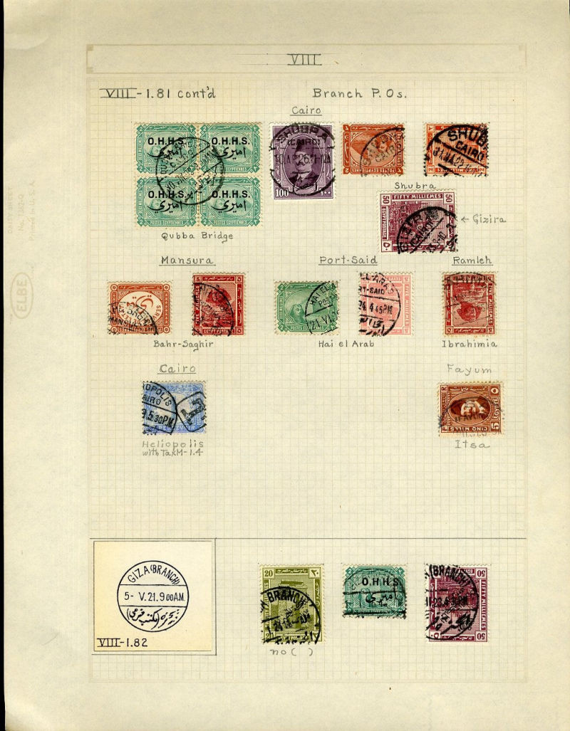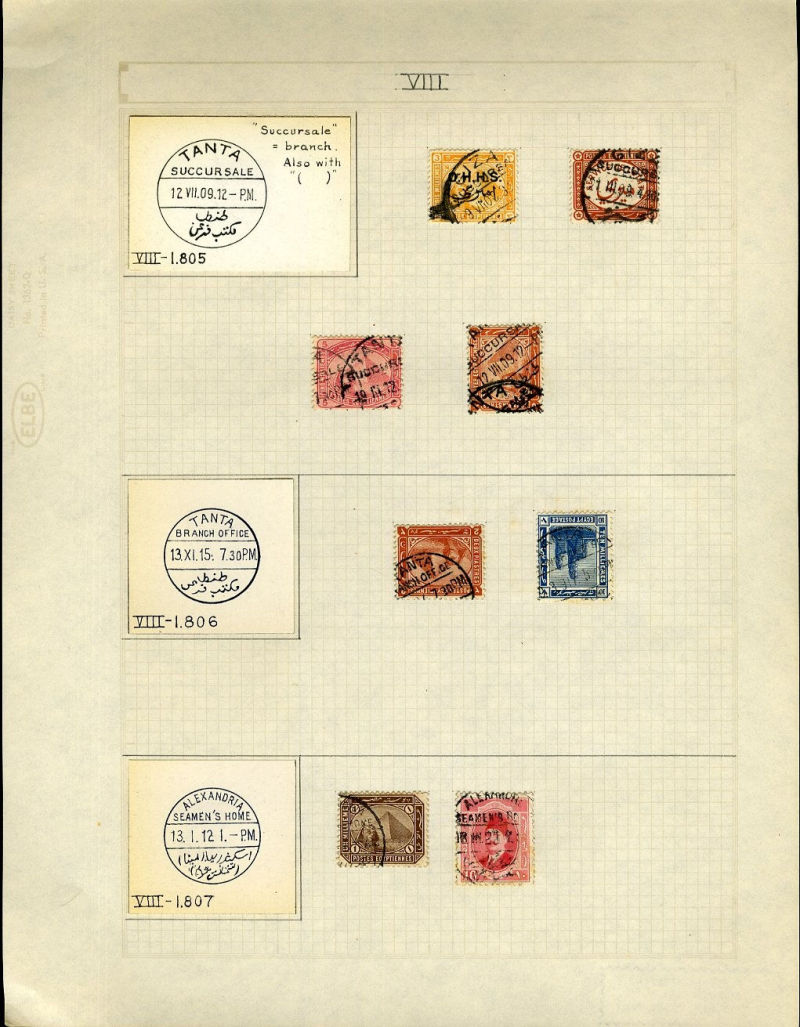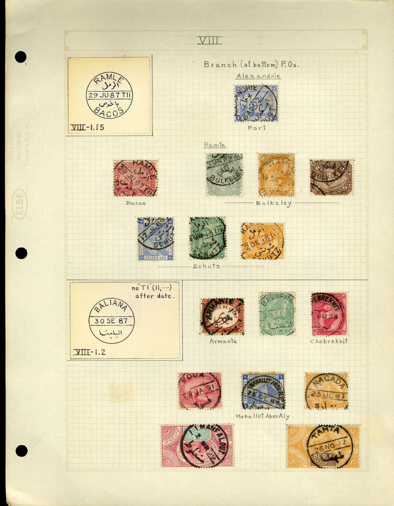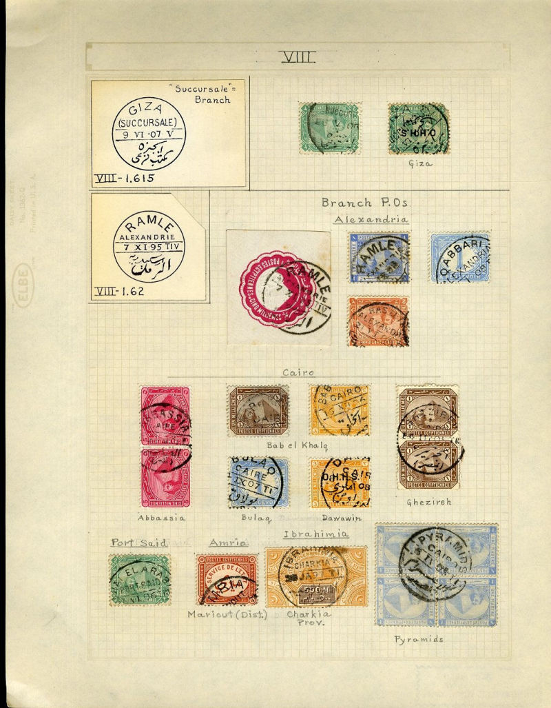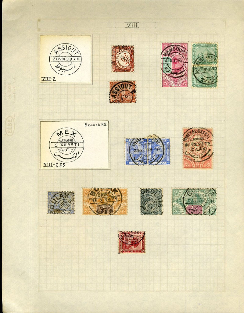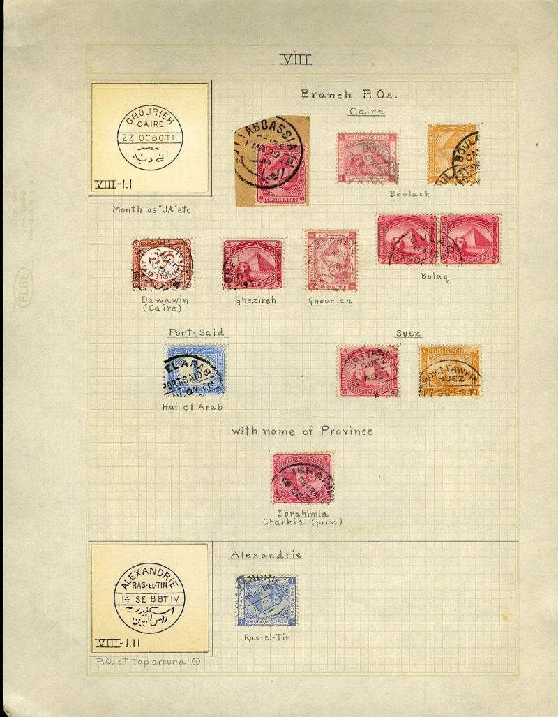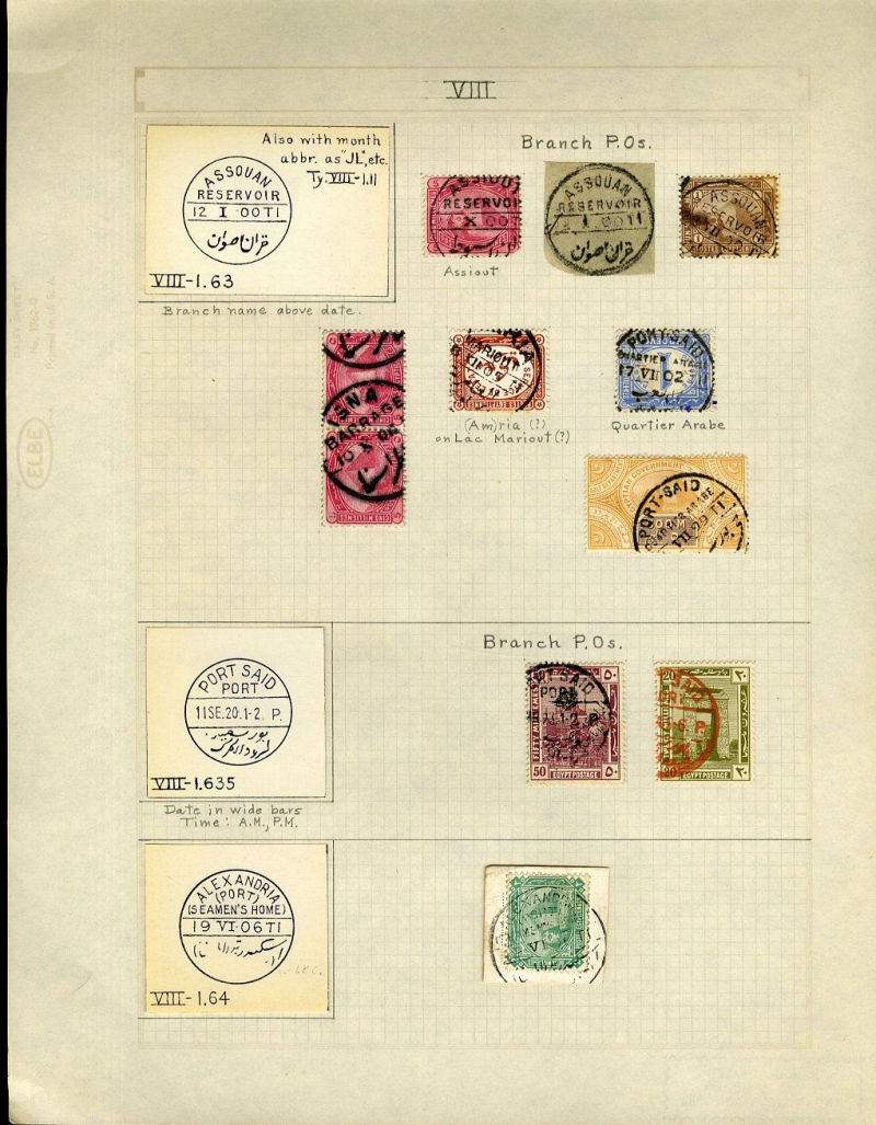 1301 O, c   imageLARGE LOTS AND COLLECTIONS EGYPT 1880s-1950s Cancelations, collection of 700+ stamps and a few covers with postmarks and postal markings (Types VIII to XII) mounted on album pages, from the collection of R. Seymour Blomfield, who is recognized for his precise drawings and work on the classification of Egyptian postmarks, interesting specialist holding (Image) (Image 2) (Image 3) (Image 4) (Image 5) (Image 6) (Image 7) (Image 8) (Image 9) (Image 10) (Image 11) (Image 12) (Image 13) (Image 14) (Image 15) (All Images)