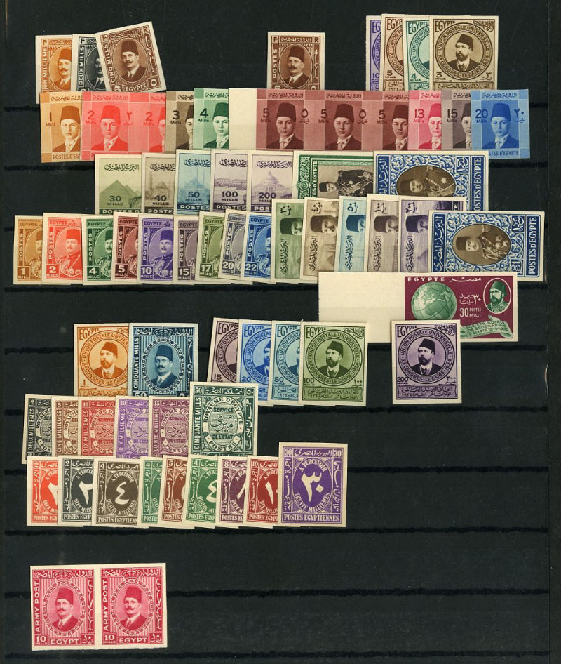 1302 og   imageLARGE LOTS AND COLLECTIONS EGYPT 1927-51 Imperforate singles with "Cancelled" on back, selection of 67 (63 different), including definitives, Commemoratives, Officials, Postage Dues, British Army Post issues, v.f. (Image)