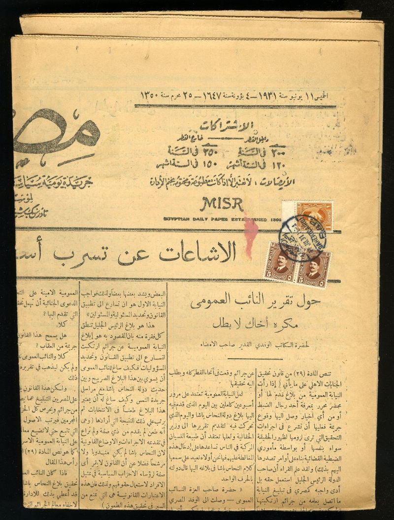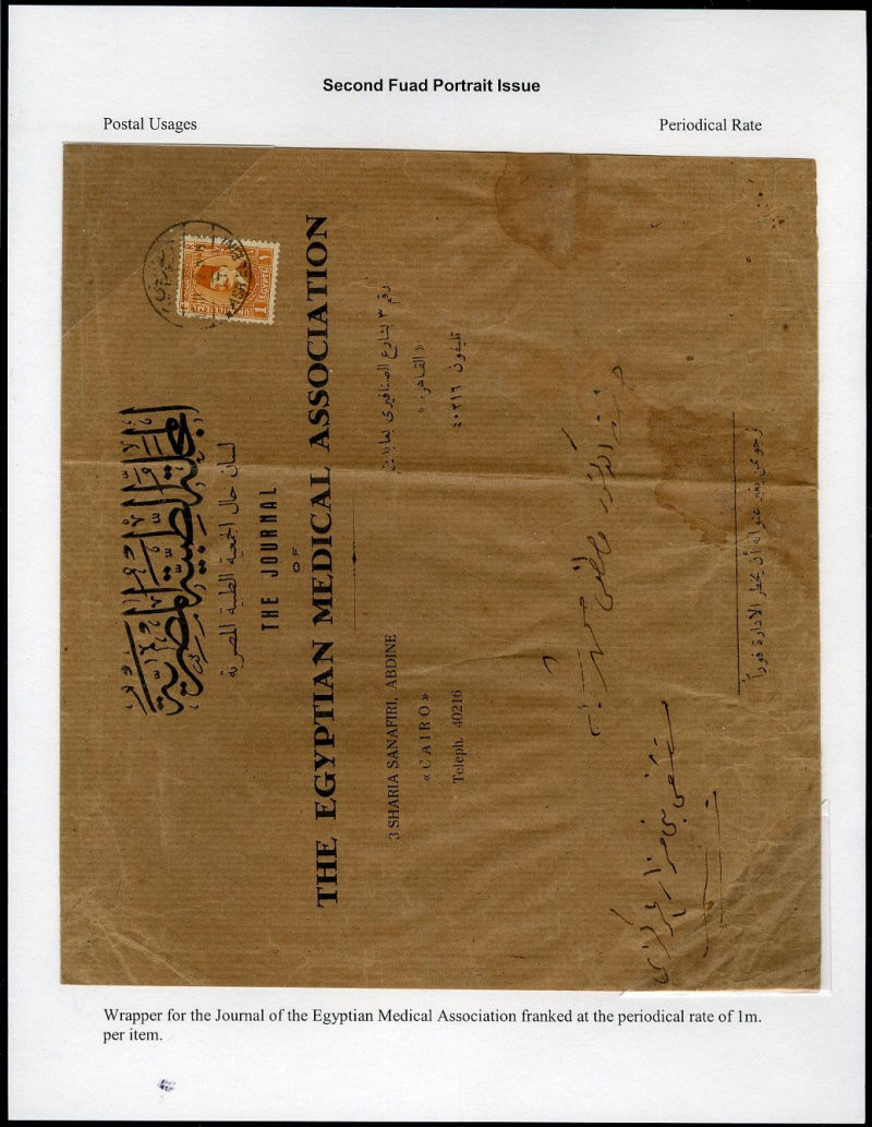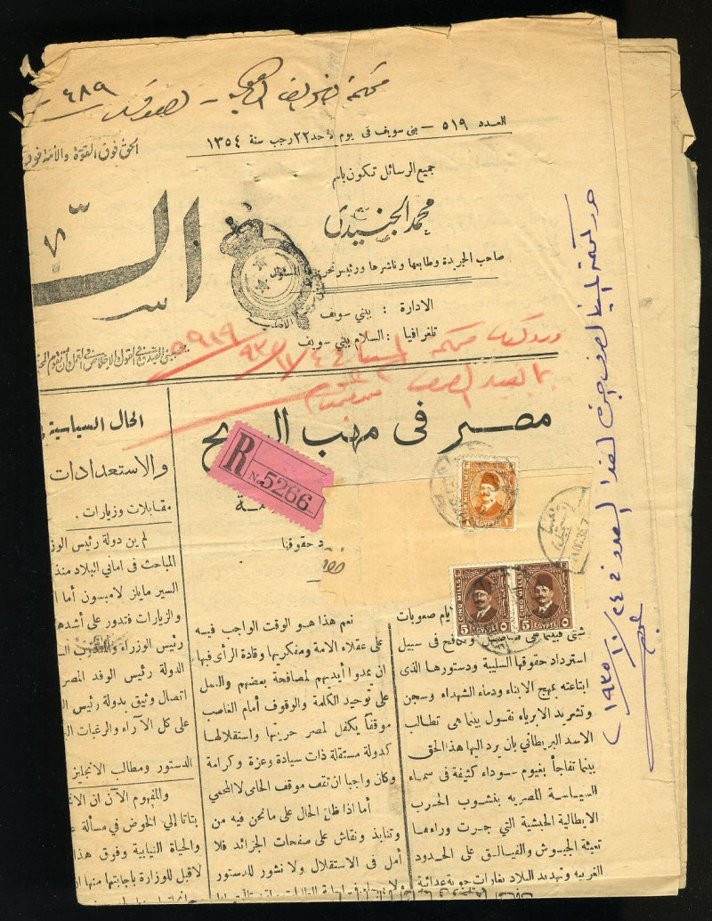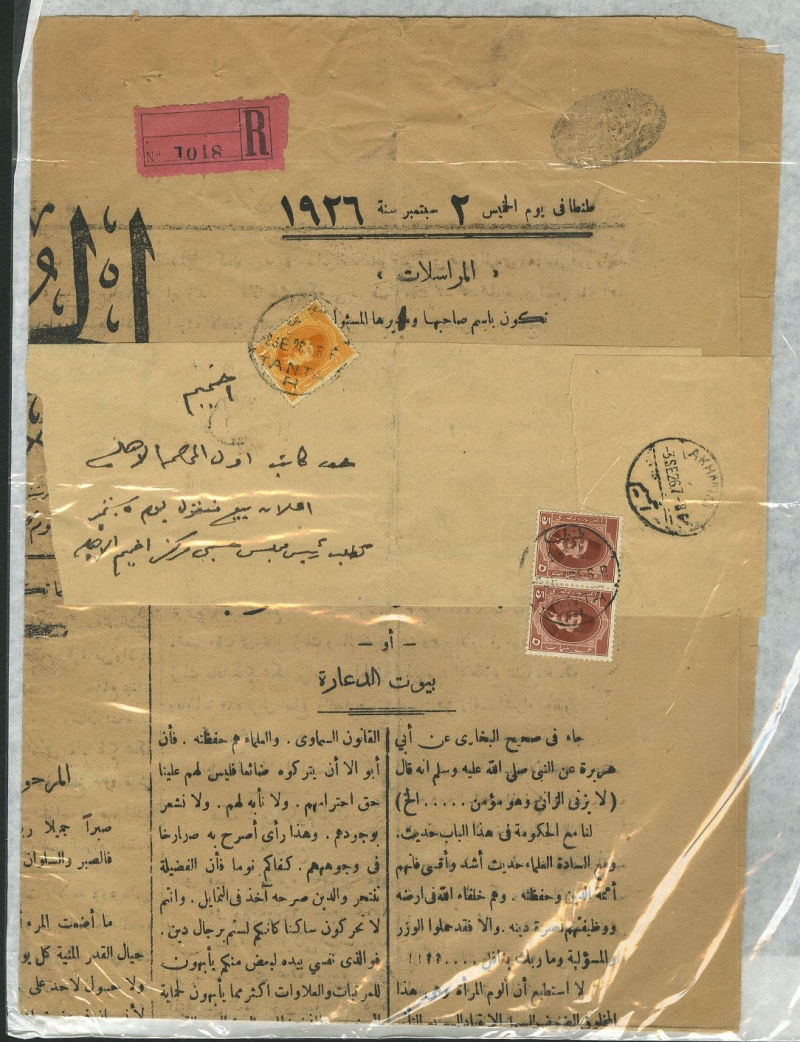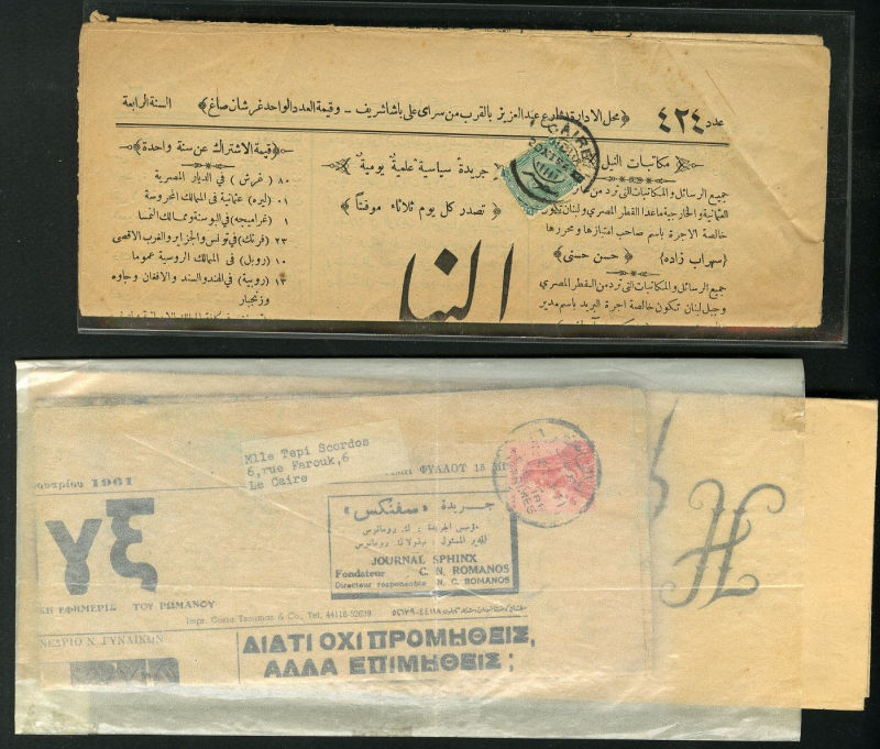 1306 c   imageLARGE LOTS AND COLLECTIONS EGYPT - Covers and Postal History 1896-1960 selection of 31 newspapers, with a variety of frankings, including the De La Rue Fourth Issue, First and Second Fuad Portrait Issue, Fuad Postes, young King Farouk, Farouk Marechal, Commemoratives and Air Post issues, mixed condition, unusual group (Image) (Image 2) (Image 3) (Image 4) (Image 5) (Image 6) (Image 7) (Image 8) (Image 9) (Image 10) (All Images)