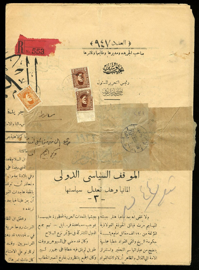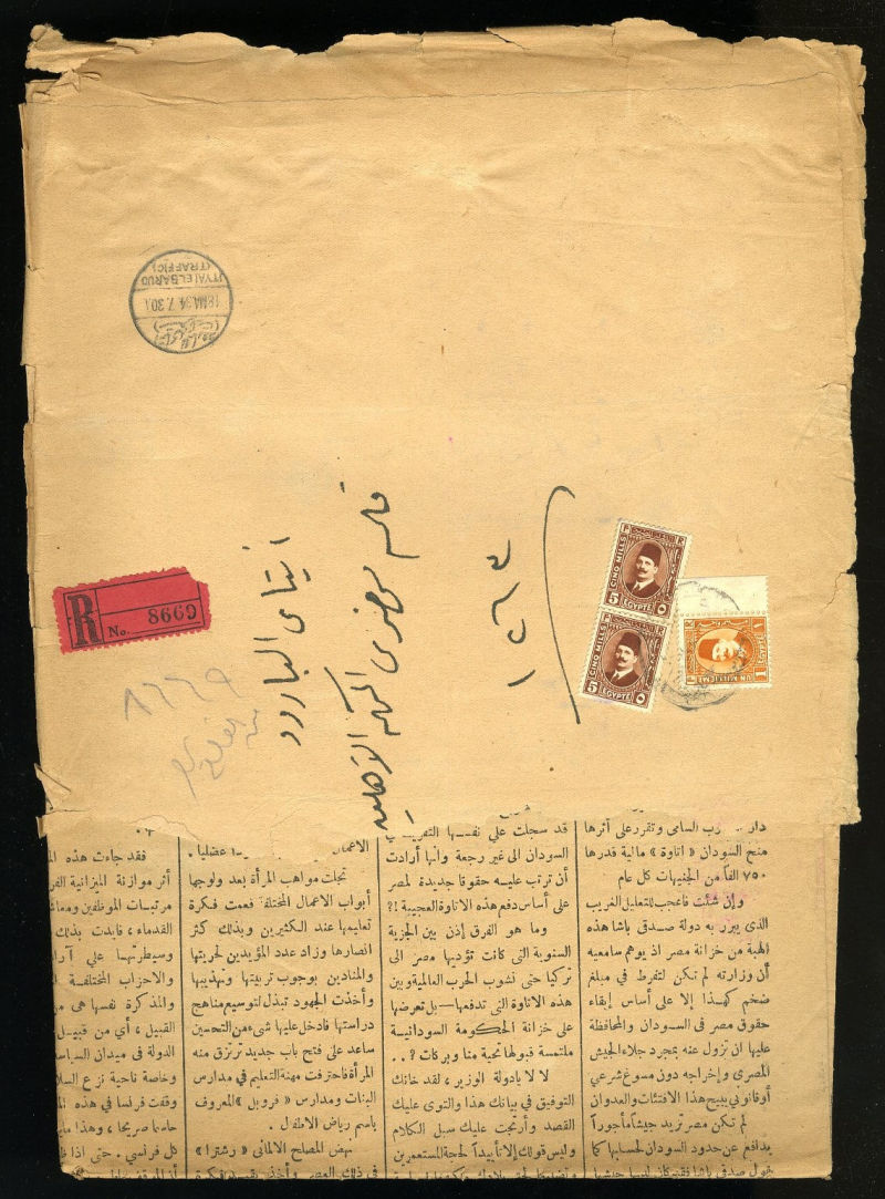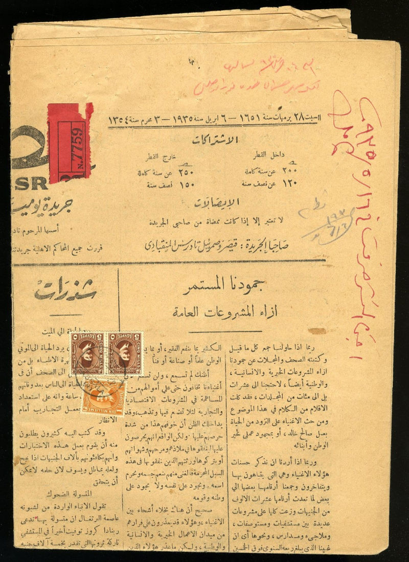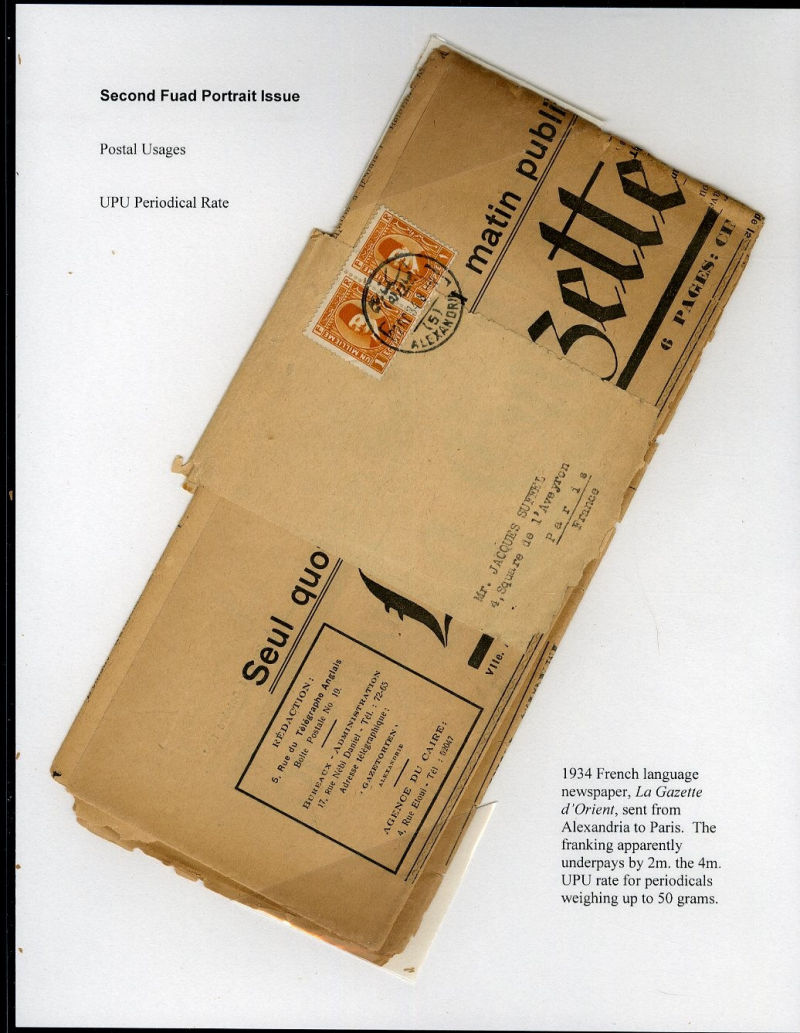 1306 c   imageLARGE LOTS AND COLLECTIONS EGYPT - Covers and Postal History 1896-1960 selection of 31 newspapers, with a variety of frankings, including the De La Rue Fourth Issue, First and Second Fuad Portrait Issue, Fuad Postes, young King Farouk, Farouk Marechal, Commemoratives and Air Post issues, mixed condition, unusual group (Image) (Image 2) (Image 3) (Image 4) (Image 5) (Image 6) (Image 7) (Image 8) (Image 9) (Image 10) (All Images)