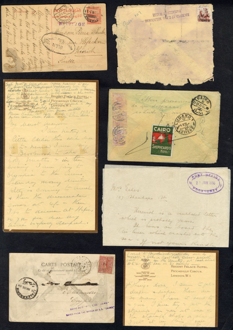 1307 c   imageLARGE LOTS AND COLLECTIONS EGYPT - Covers and Postal History 1905-38 four wreck/crash covers, including 1905 post card from France to Alexandria with straight-line hand stamp in violet; "Saved from the Wreck of S.S. Cairo;" 1918 4m Egypt postal stationary card from Alexandria to Switzerland with violet "Naufrage" handstamp recovered from S.S. Kingstonian which had been torpedoed by a German submarine; 1921 cover from Shepheard''s Hotel, Alexandria to Switzerland with missing stamps and a manuscript note on reverse stating that the letter had been recovered from a shipwreck; and a tatty 1935 stamped cover from England with illegible address that was recovered from an Imperial Airways flight of the "City of Khartoum" which crashed in the sea, mixed condition but scarce (Image)
