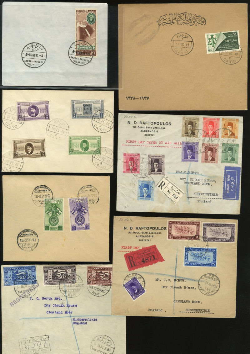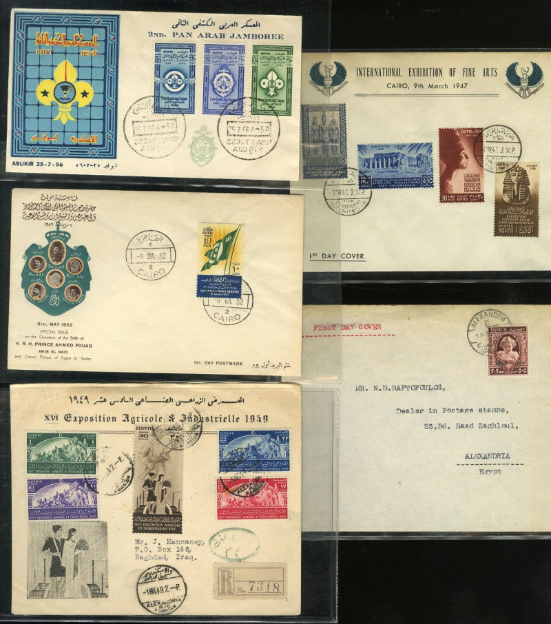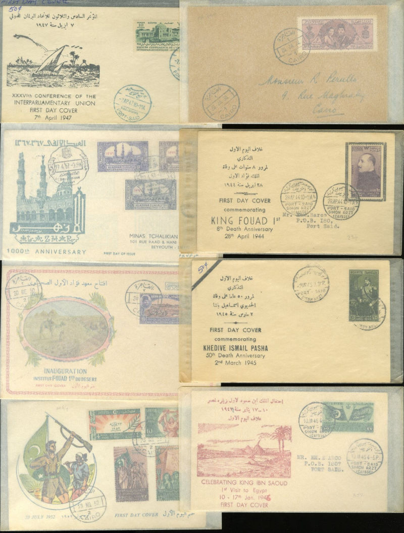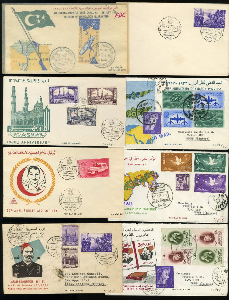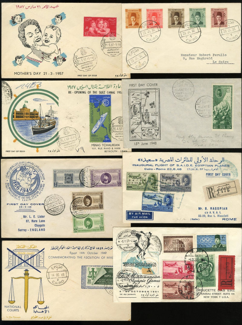 1308 c   imageLARGE LOTS AND COLLECTIONS EGYPT - Covers and Postal History 1925-57 First Day Covers, group of 50+ (42 different), with a variety of 1925-57 Commemoratives, including Navigation, Cotton, Ophthalmologic and Leprosy Congresses, fine-v.f. (Image) (Image 2) (Image 3) (Image 4) (Image 5) (Image 6) (Image 7) (Image 8) (All Images)