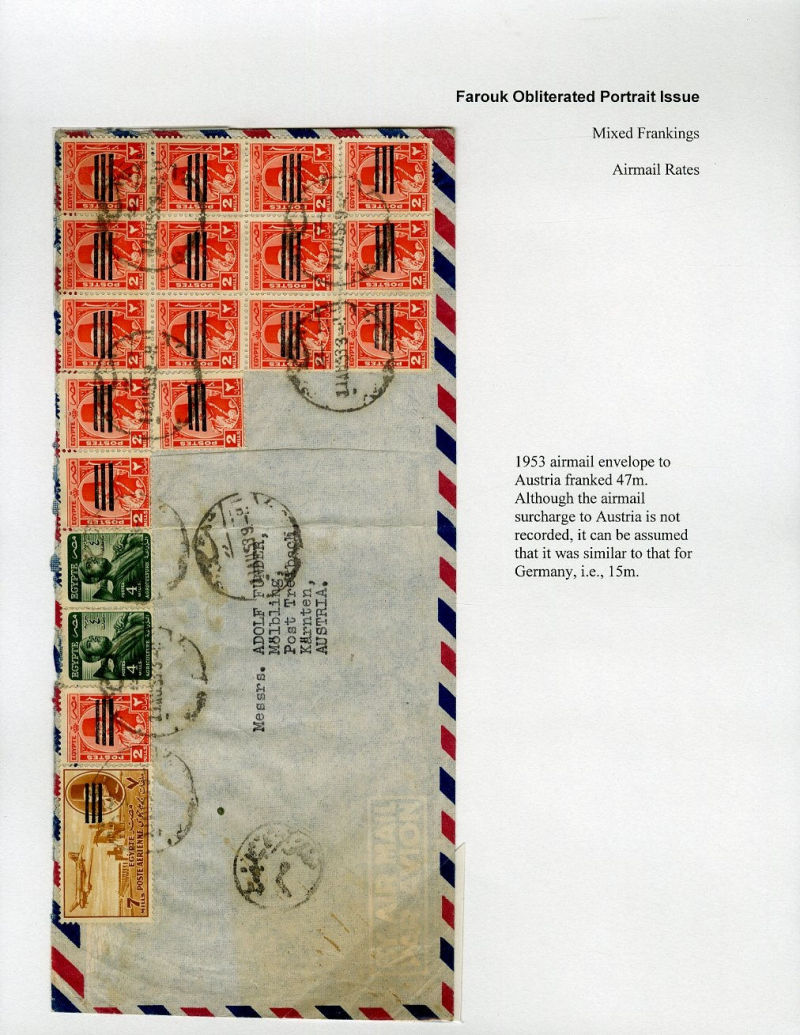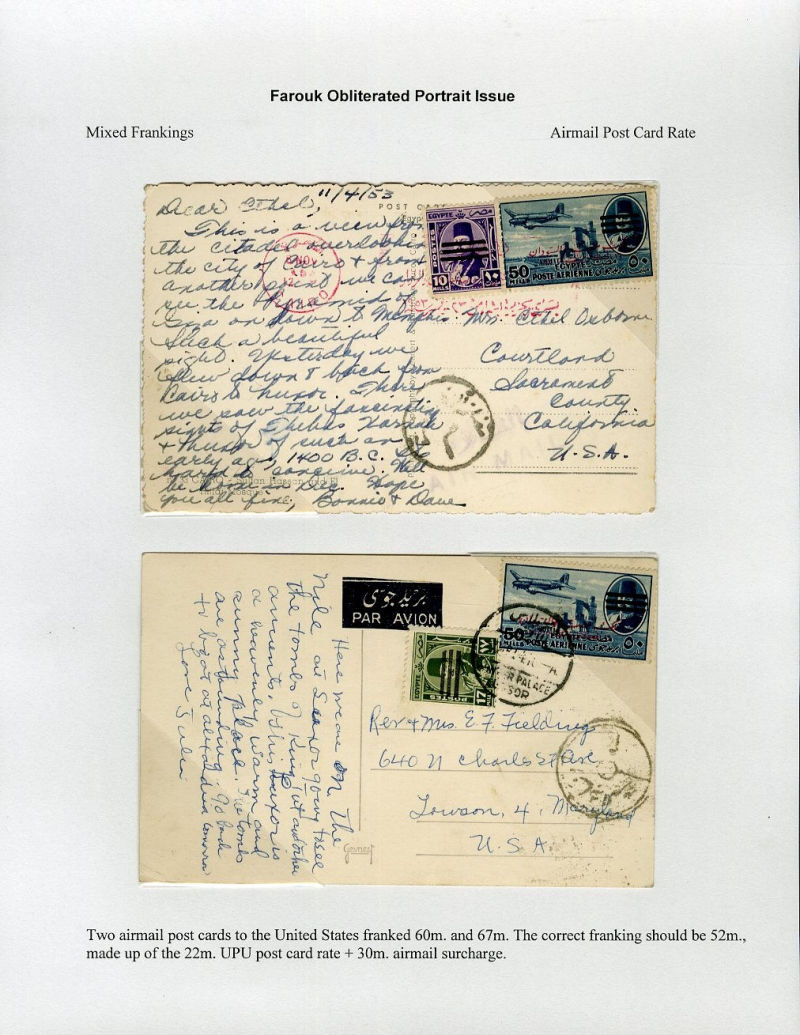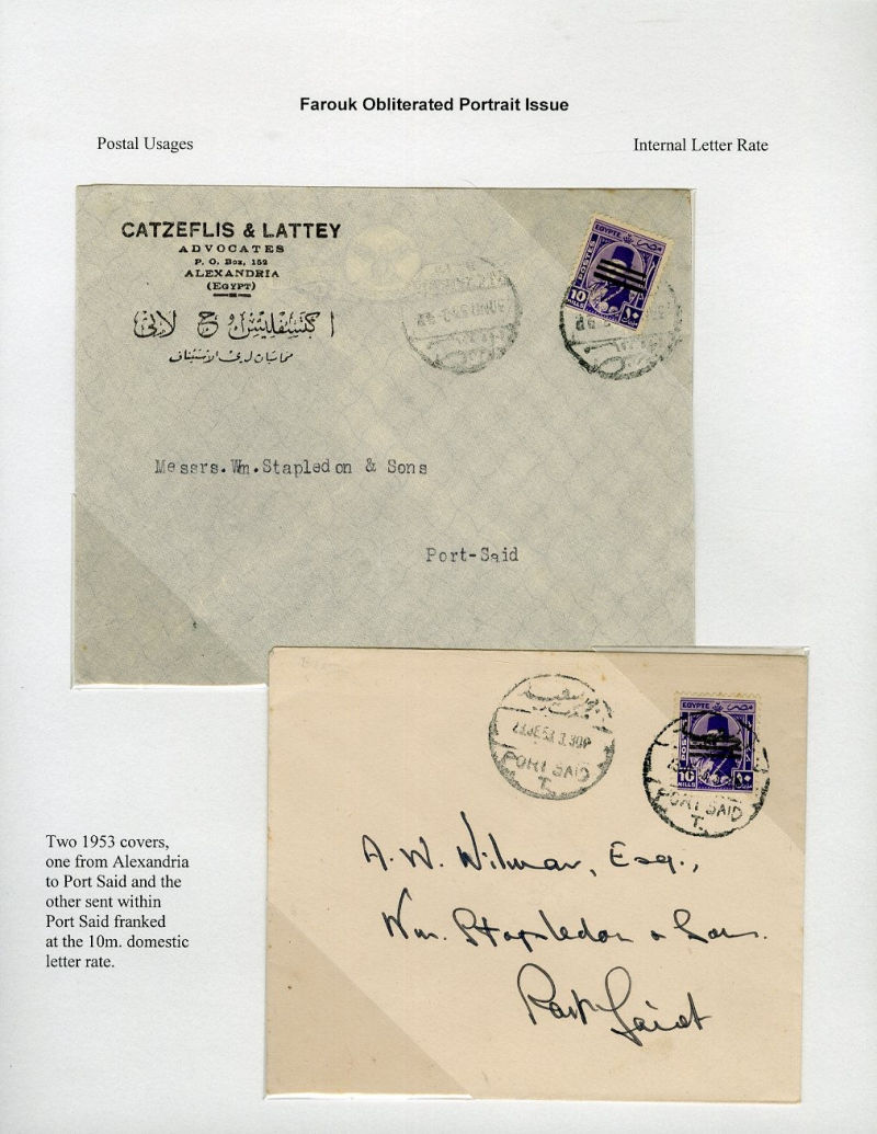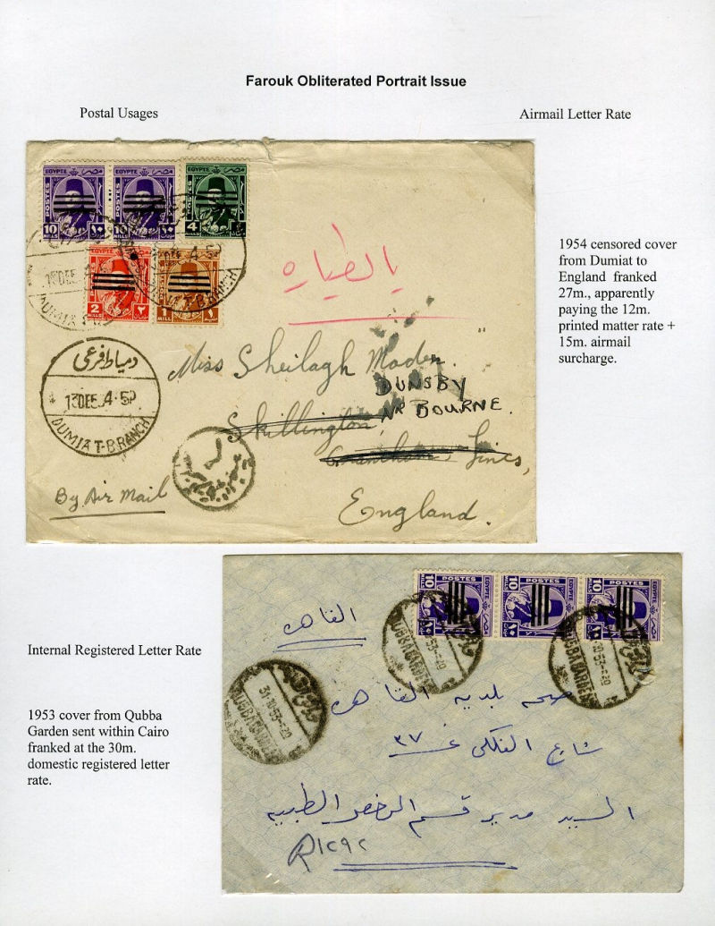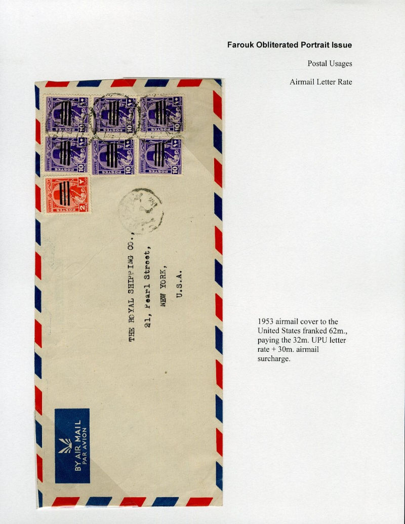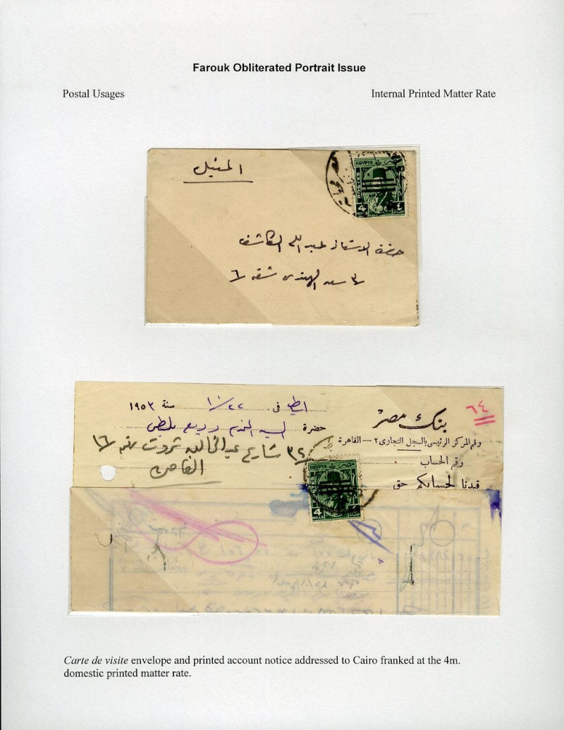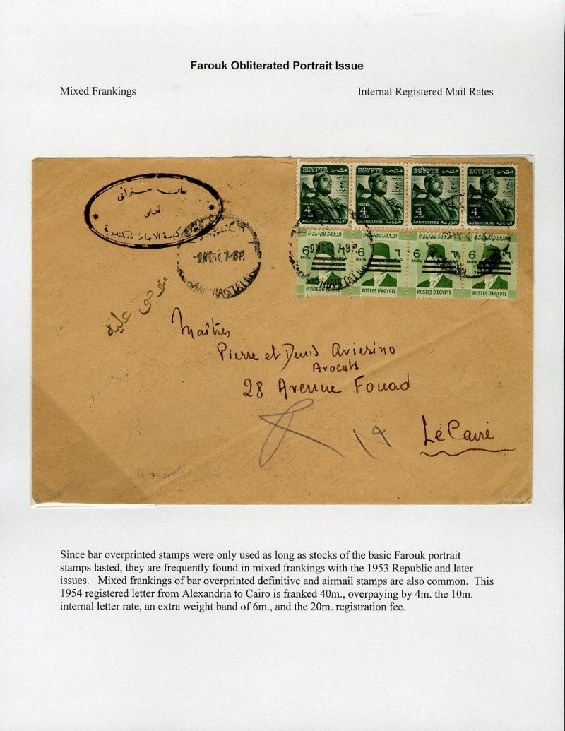 1310 c   imageLARGE LOTS AND COLLECTIONS EGYPT - Covers and Postal History 1953 Farouk Obliterated Portrait Issue, collection of 60+ covers or cards franked with the 1m-100m Bar-overprinted definitives and Air Post stamps, mounted on exhibit pages, showing a wide range of frankings, uncommon destinations, postal markings, etc. (Image) (Image 2) (Image 3) (Image 4) (Image 5) (Image 6) (Image 7) (Image 8) (Image 9) (Image 10) (Image 11) (Image 12) (Image 13) (Image 14) (Image 15) (Image 16) (Image 17) (Image 18) (Image 19) (Image 20) (Image 21) (Image 22) (Image 23) (Image 24) (Image 25) (Image 26) (Image 27) (Image 28) (Image 29) (Image 30) (Image 31) (Image 32) (Image 33) (Image 34) (Image 35) (All Images)