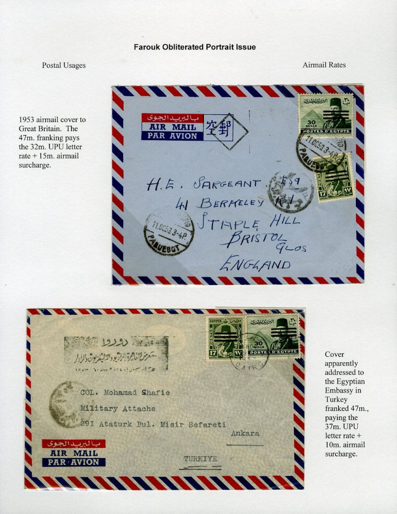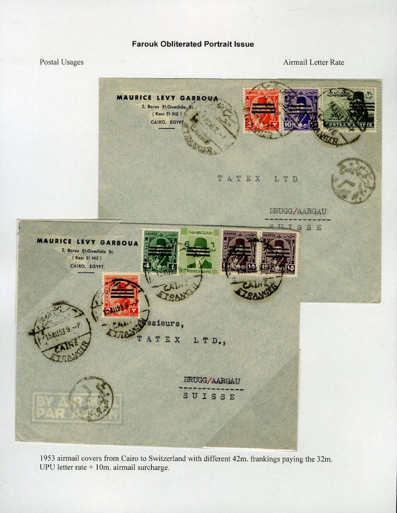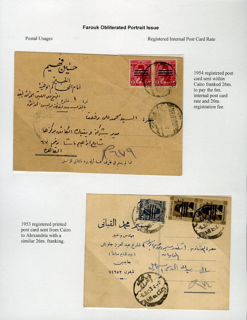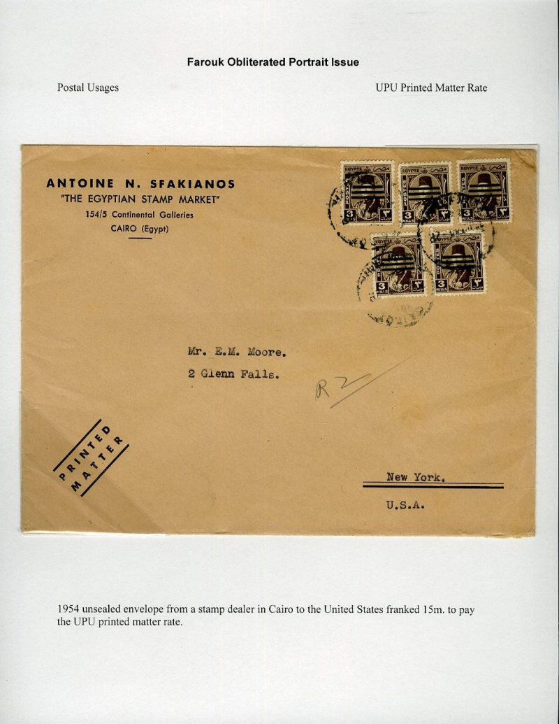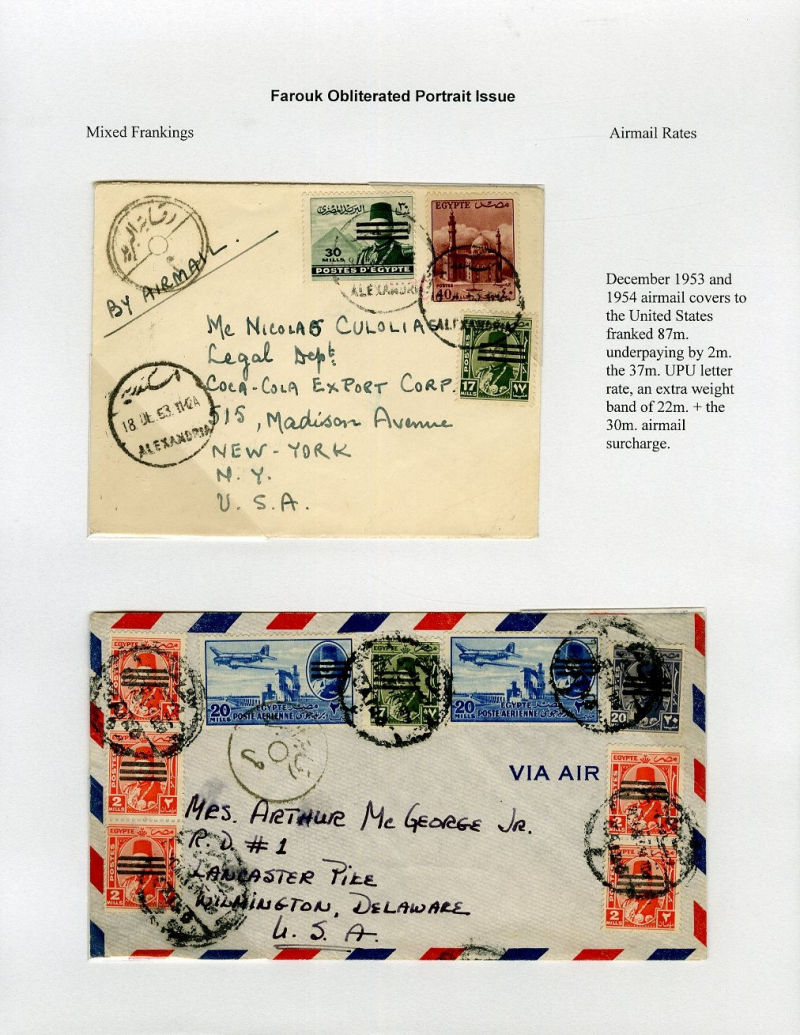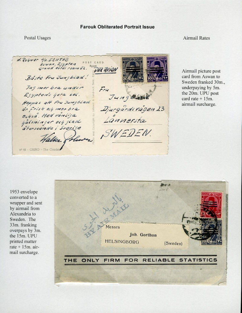 1310 c   imageLARGE LOTS AND COLLECTIONS EGYPT - Covers and Postal History 1953 Farouk Obliterated Portrait Issue, collection of 60+ covers or cards franked with the 1m-100m Bar-overprinted definitives and Air Post stamps, mounted on exhibit pages, showing a wide range of frankings, uncommon destinations, postal markings, etc. (Image) (Image 2) (Image 3) (Image 4) (Image 5) (Image 6) (Image 7) (Image 8) (Image 9) (Image 10) (Image 11) (Image 12) (Image 13) (Image 14) (Image 15) (Image 16) (Image 17) (Image 18) (Image 19) (Image 20) (Image 21) (Image 22) (Image 23) (Image 24) (Image 25) (Image 26) (Image 27) (Image 28) (Image 29) (Image 30) (Image 31) (Image 32) (Image 33) (Image 34) (Image 35) (All Images)