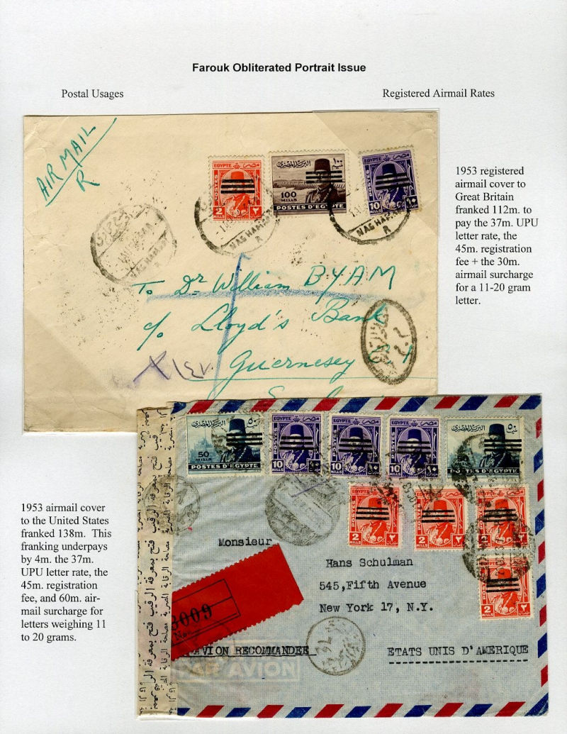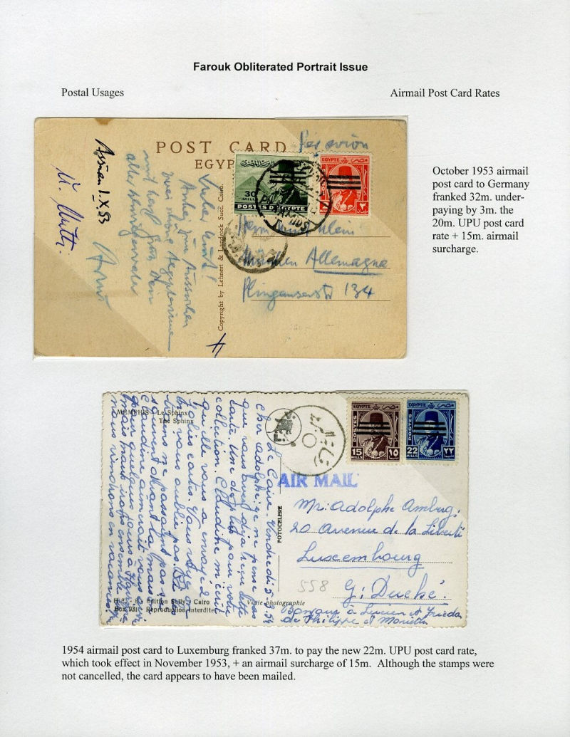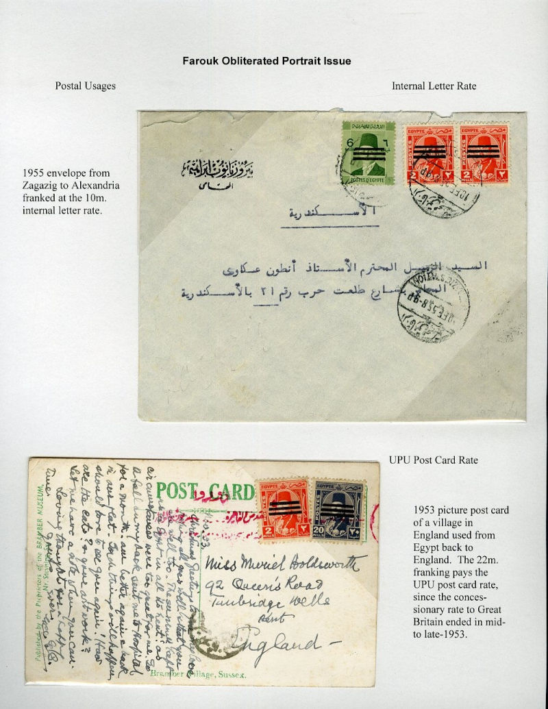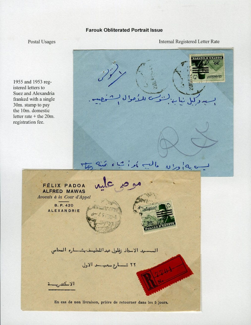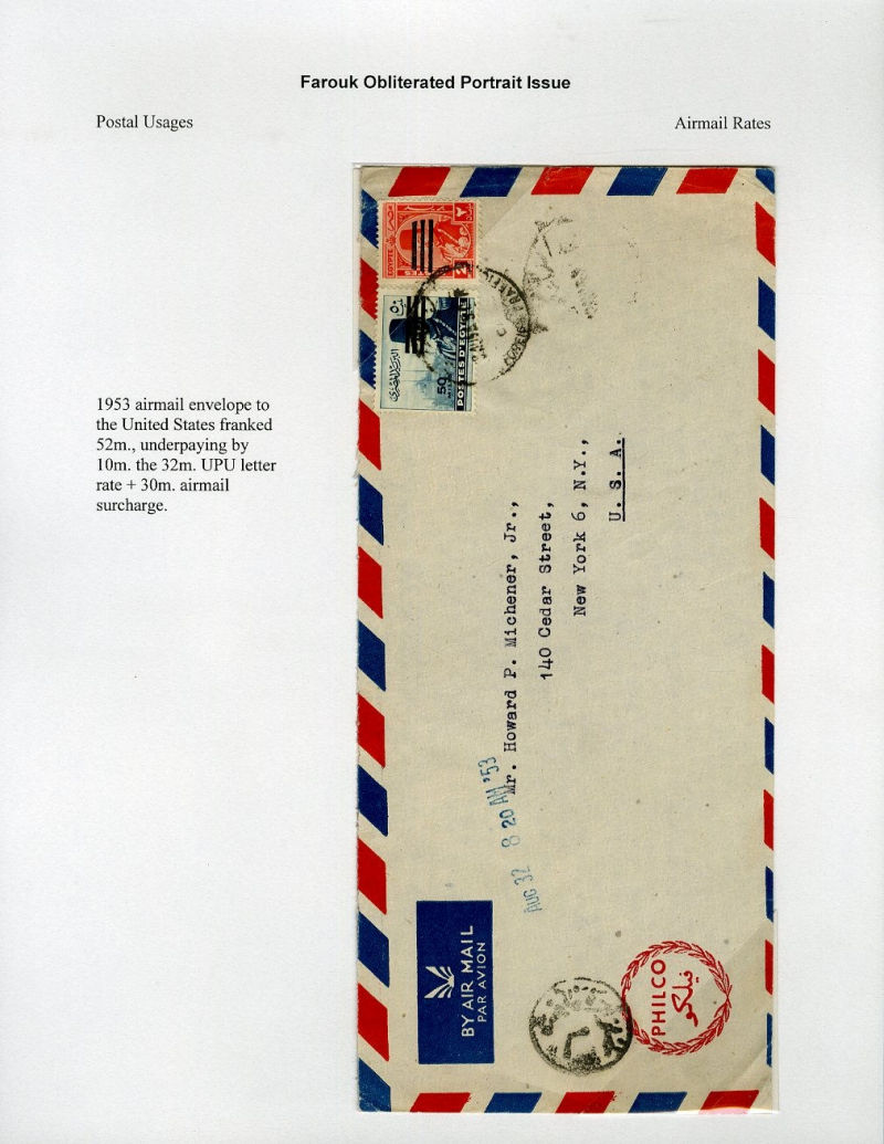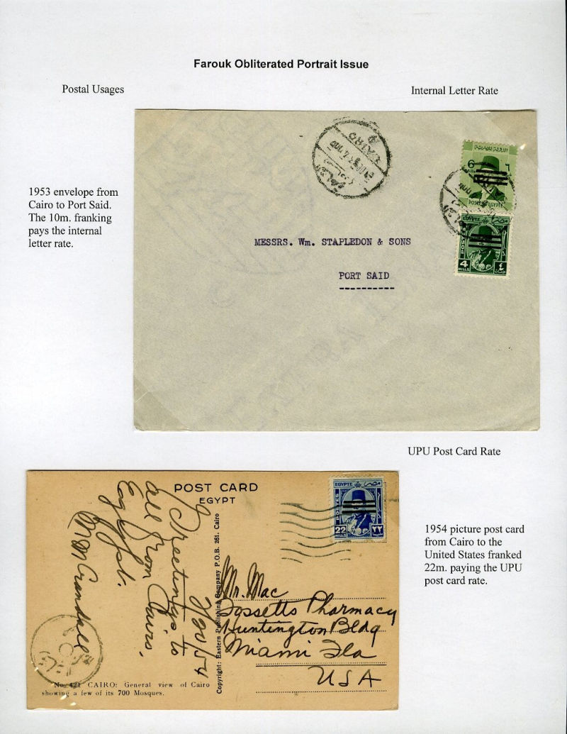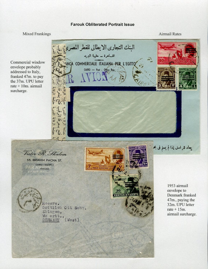 1310 c   imageLARGE LOTS AND COLLECTIONS EGYPT - Covers and Postal History 1953 Farouk Obliterated Portrait Issue, collection of 60+ covers or cards franked with the 1m-100m Bar-overprinted definitives and Air Post stamps, mounted on exhibit pages, showing a wide range of frankings, uncommon destinations, postal markings, etc. (Image) (Image 2) (Image 3) (Image 4) (Image 5) (Image 6) (Image 7) (Image 8) (Image 9) (Image 10) (Image 11) (Image 12) (Image 13) (Image 14) (Image 15) (Image 16) (Image 17) (Image 18) (Image 19) (Image 20) (Image 21) (Image 22) (Image 23) (Image 24) (Image 25) (Image 26) (Image 27) (Image 28) (Image 29) (Image 30) (Image 31) (Image 32) (Image 33) (Image 34) (Image 35) (All Images)