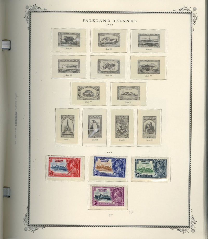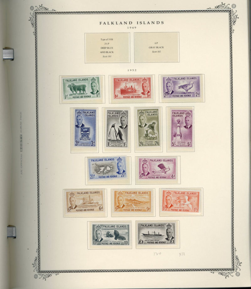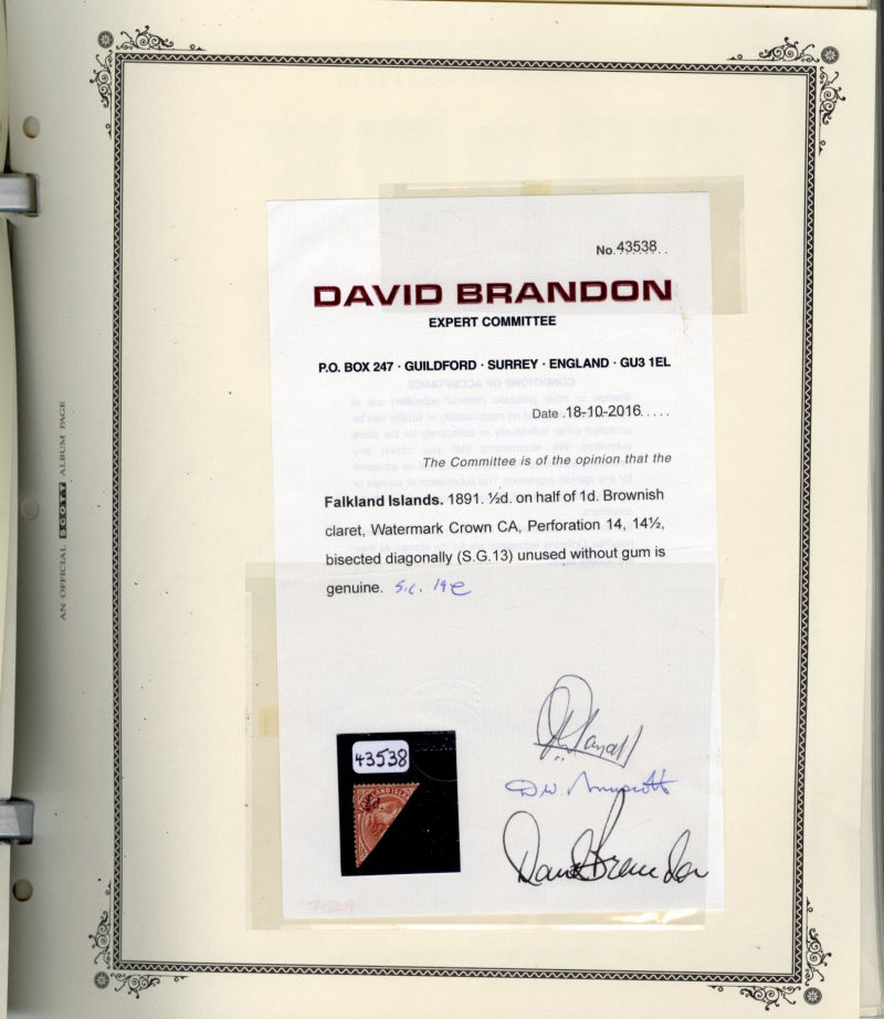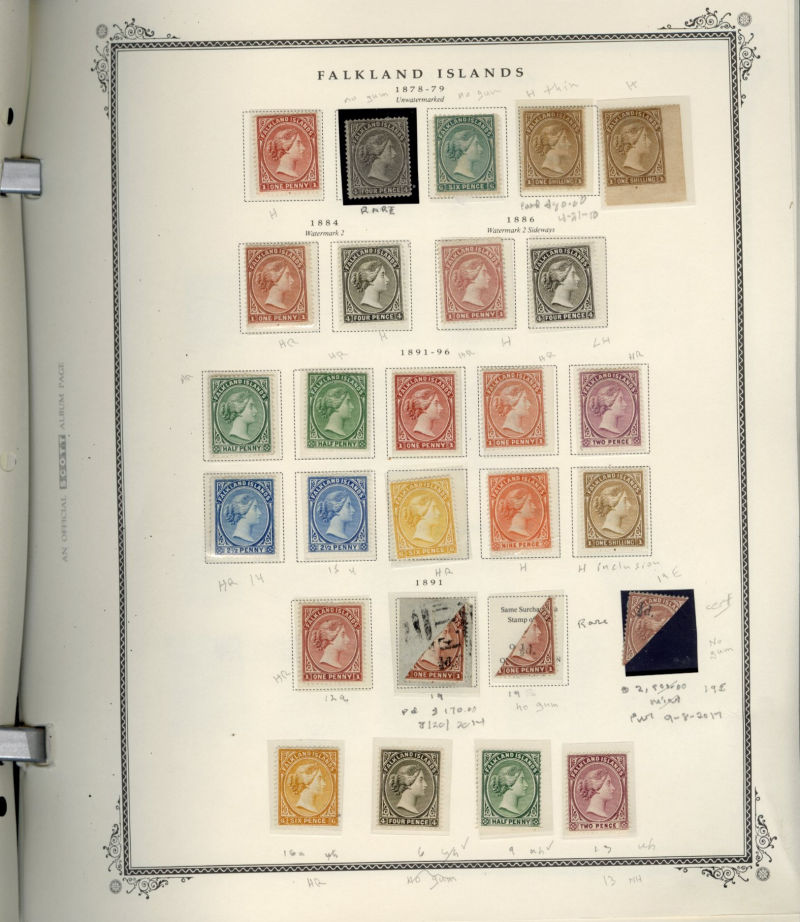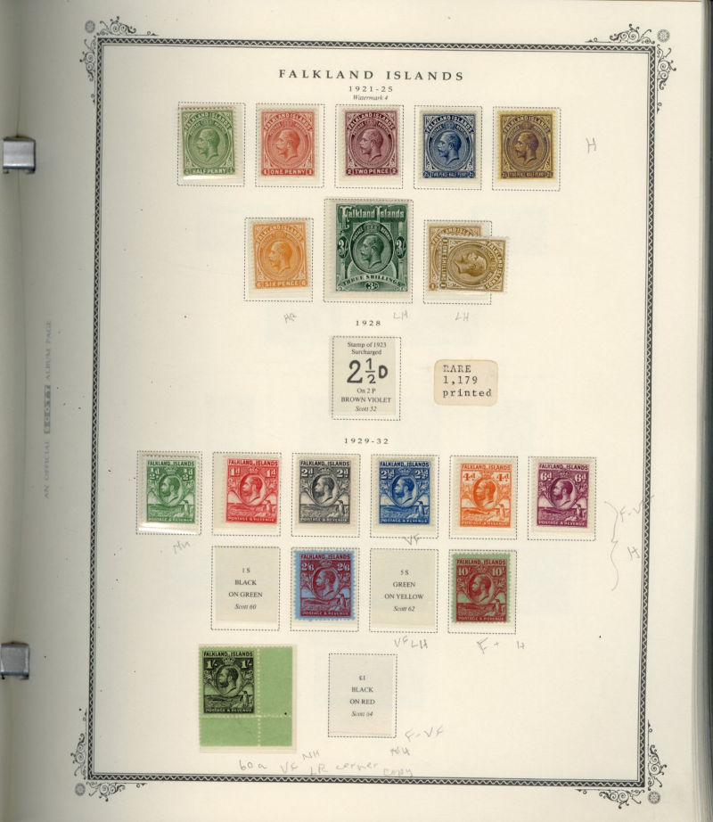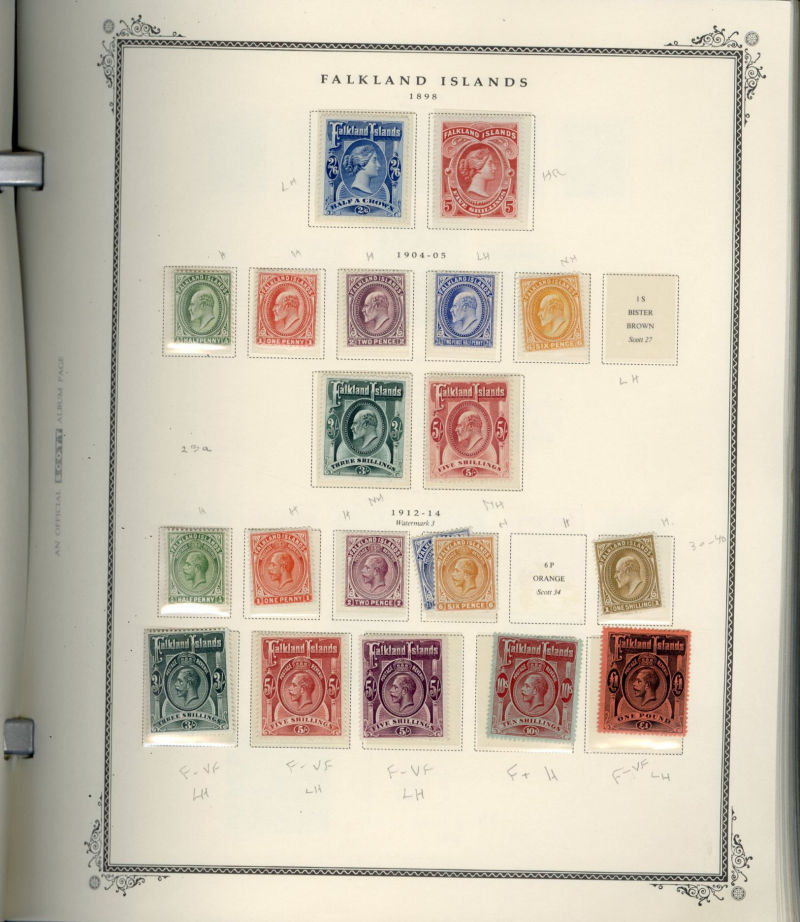 1313 og   imageLARGE LOTS AND COLLECTIONS FALKLAND ISLANDS 1878-2021 collection in Scott album, with better singles and sets, first issues complete, diagonal bisectd,19,19E (unused, with 2016 Brandon certificate), 1898 Queen Victoria 2sh6p, 5sh, KEVII and George V to £1, Omnibus issues, with George VI sets (n.h.), various commemoratives, definitives, booklets, souvenir sheets, etc., minor condition problems among early issues, generally fine-v.f. (Image) (Image 2) (Image 3) (Image 4) (Image 5) (Image 6) (Image 7) (Image 8) (All Images)