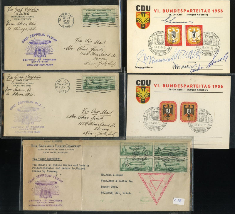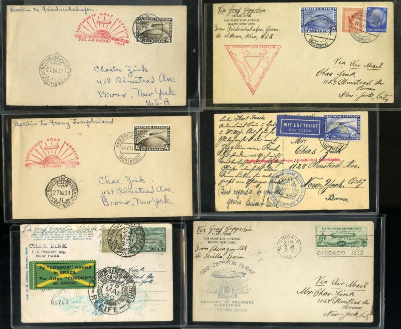 1442 c   imageLARGE LOTS AND COLLECTIONS WORLDWIDE COVERS and POSTAL HISTORY Zeppelin Flights 1930-33 selection, including Germany Polar Flight, 4m brown (C42), two singles, v.f., each on flown and cacheted cover from Friedrichshafen to the Icebreaker Malyguin, Chicago Flight with 2m ultramarine (C44), Brazil card with 5,000r green from Recife to New York, 50c green (C18), three singles and block of four on covers from Chicago, Akron, Miami and New York, fine-v.f. (Image) (Image 2) (All Images)