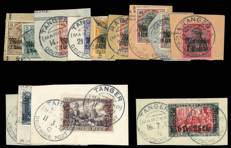 COLONIES German Offices in Morocco (45-57) 1911 Marokko surcharges, complete set of 13 used, mostly canceled on pieces, variety of postmarks including Tanger, Rabat, Casablanca, etc., fine-v.f., many signed, cat. value $758 (Image)