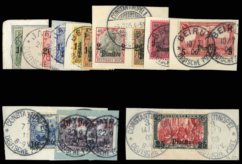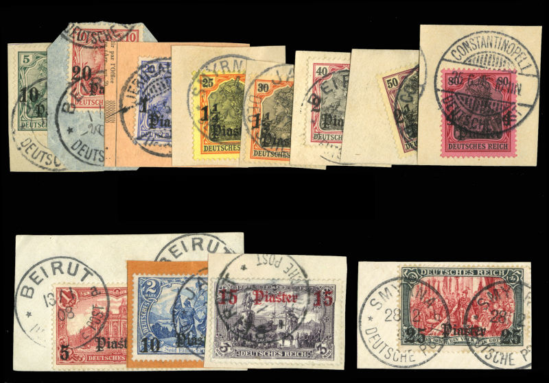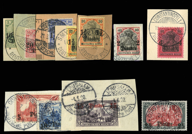 COLONIES German Offices in the Turkish Empire (31-42) 1905 Deutsches Reich (unwatermarked) surcharges complete set of 12, used, mostly on pieces, fine-v.f., cat. value $752