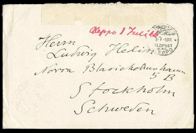 COLONIES German-Persian Military Mission 1916 (3 July) cover from Aleppo to Sweden (addressed to Ludwig Hedin, a family member of the famous Sven Hedin), "Mil.Miss.Aleppo" departure pmk, datelined in red "Aleppo 1 July", with faint but readable round