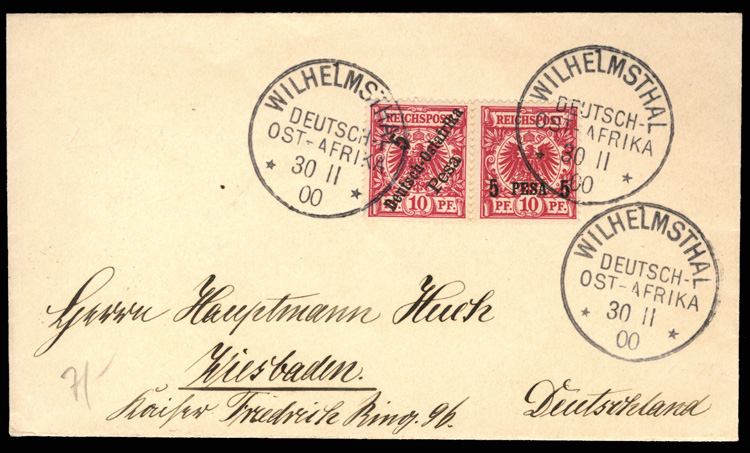 COLONIES German East Africa 1900 (30 Feb) small cover to Germany, franked with two different 5pesa surcharges, tied by Wilhelmsthal Deutsch Ost-Afrika departure cds, v.f., with Wiesbaden arrival (Image)