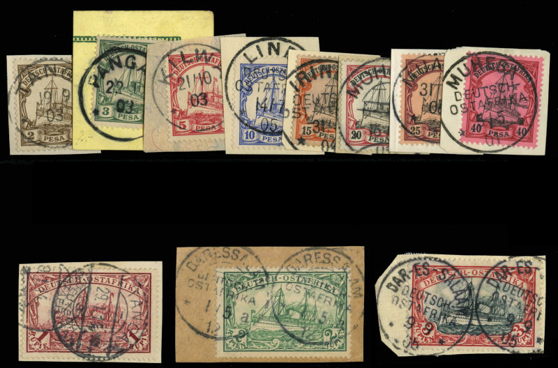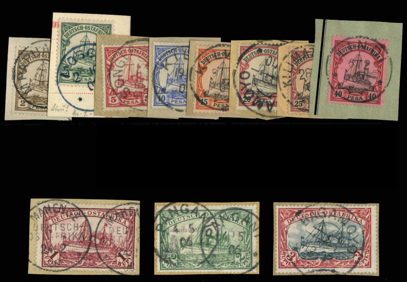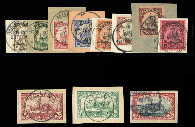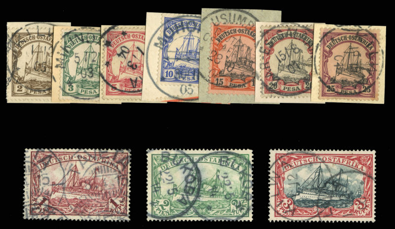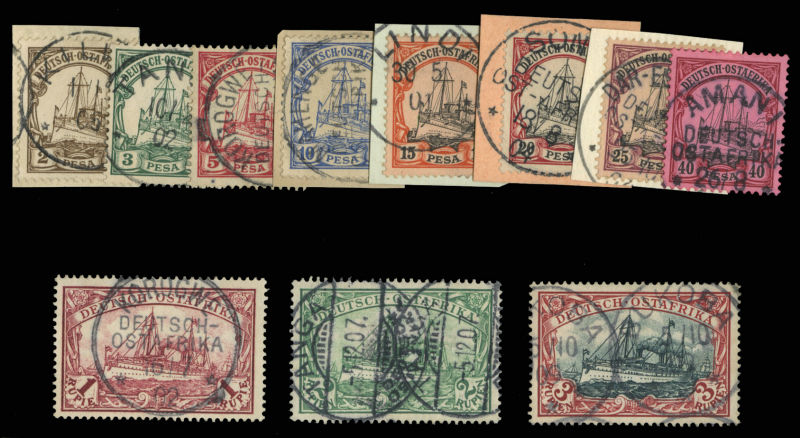 COLONIES German East Africa (11-21) 1900 Yacht 2p-3R complete set of 11 used, mostly on pieces, many better cancels (Kilwa, Lindi, Amani, Bagamoyo, etc.), fine-v.f., cat. value $495 (Image)